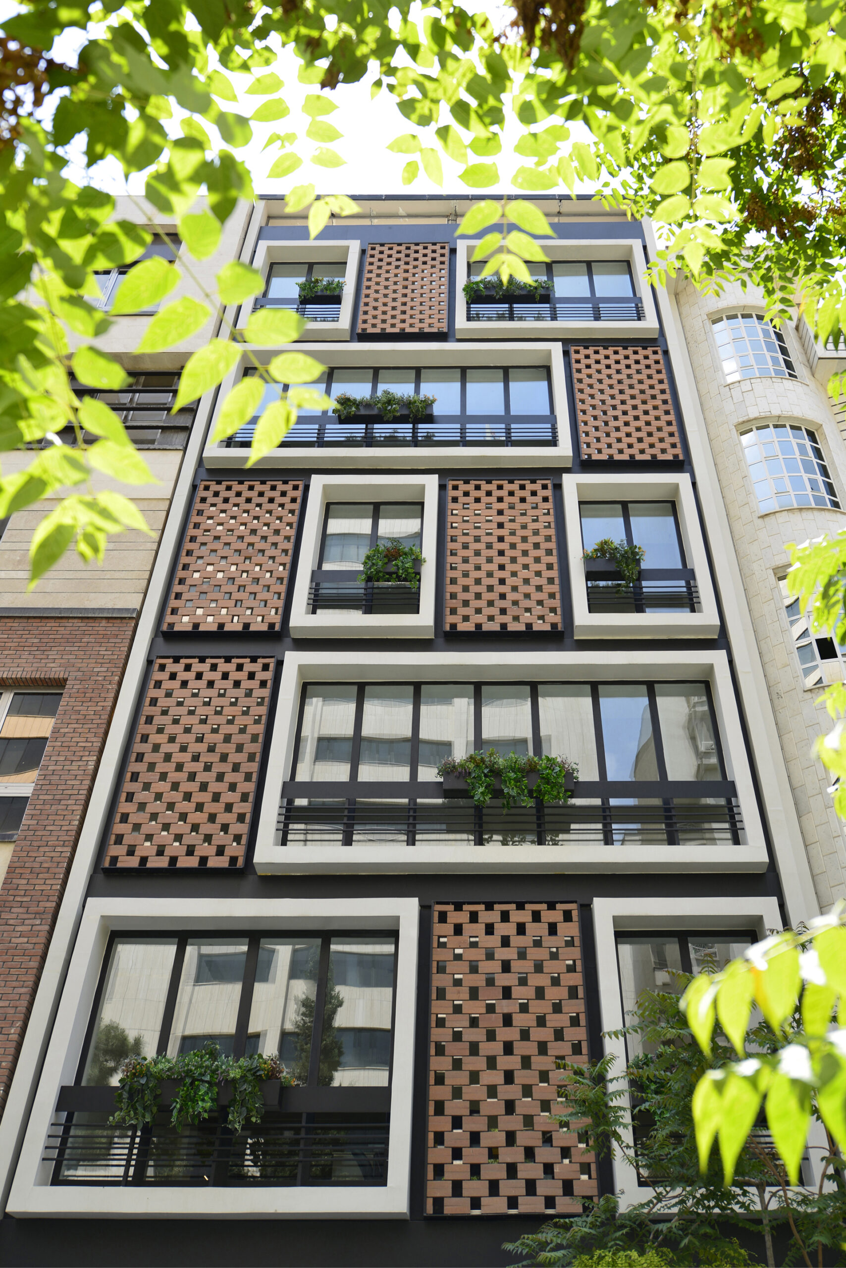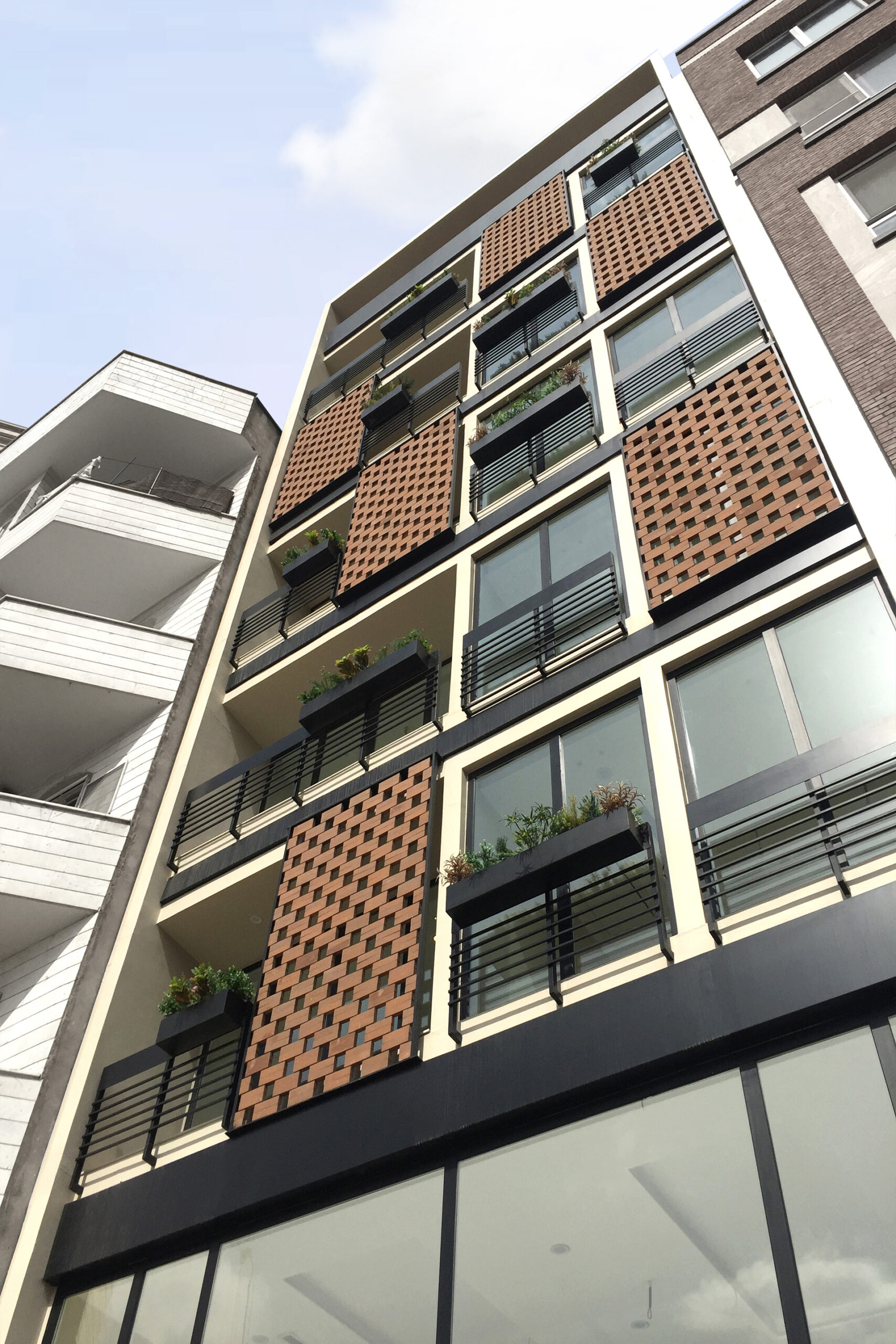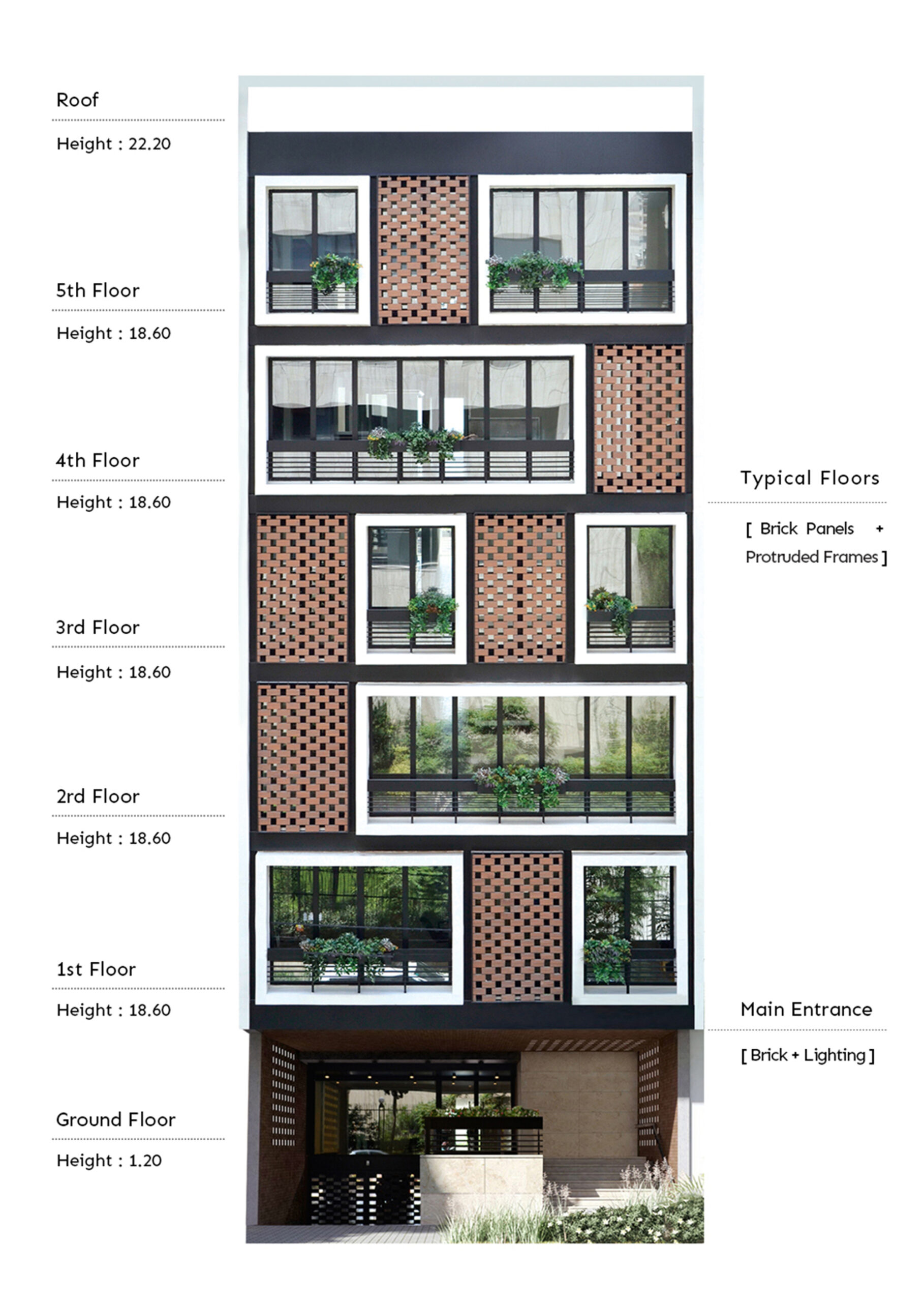 During a different time of a day, the brick patterns create a beautiful effect of light and shadow inside each unit. This phenomenon creates variety, increases space quality and provides visual and heat comfort for residents while it plays an effective role in energy saving. Rooftop garden and modular flower boxes in front of the windows are designed to improve environmental quality while accentuating the aesthetic values.