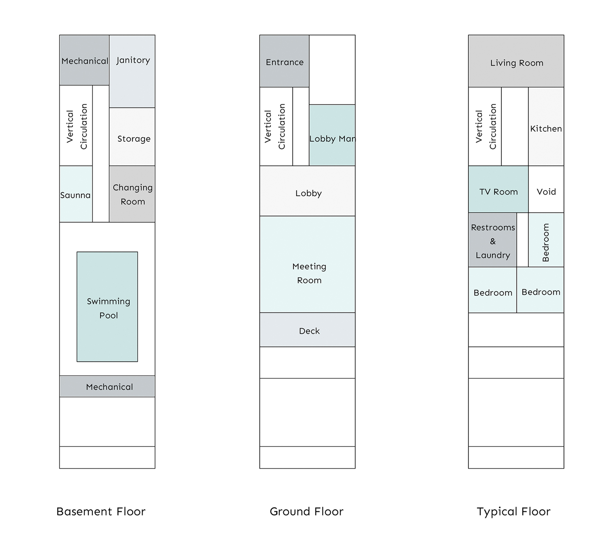 Apartment no.135 is a five-story residential building located in Saadat Abad, northwest of Tehran. Each floor contains a single three-bedroom unit. The ground floor houses the main entrance, lobby, and a multi-purpose room. Other amenities such as pool, sauna, Jacuzzi, and parking are located in the basement.
