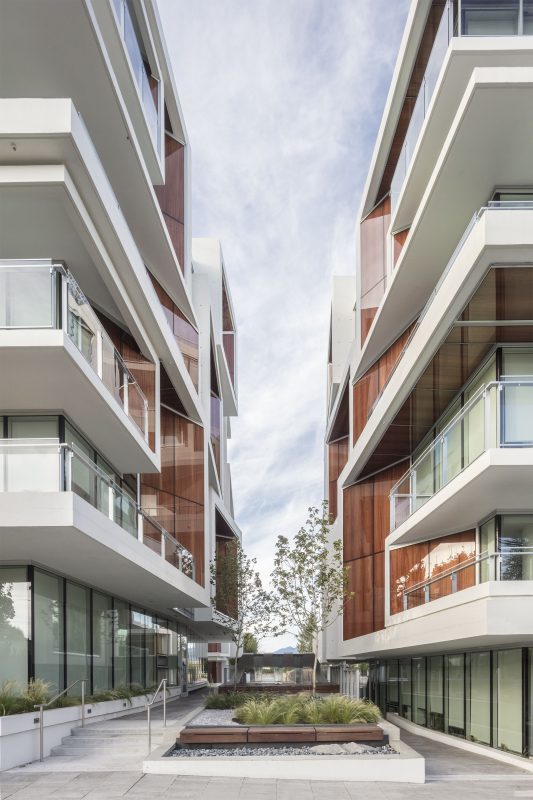 The building’s ‘campus-like’ massing creates interstitial social spaces: landscaped courtyards, mid-block water fountain and seating, and two, 6,000 SF fully-communal rooftop terraces that include urban agriculture, a children’s play place and BBQ areas where all can share Vancouver’s striking mountain views.