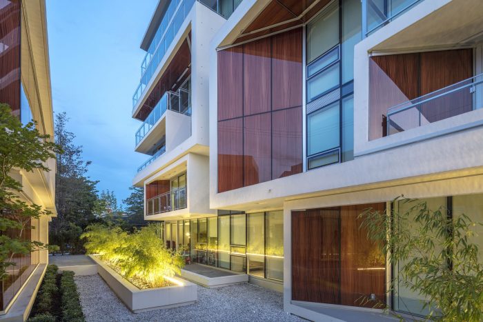 The six building blocks are bisected with water gardens and bamboo courtyards that animate volumes with reflective light. The shallow massing results in bright, light-filled residences.