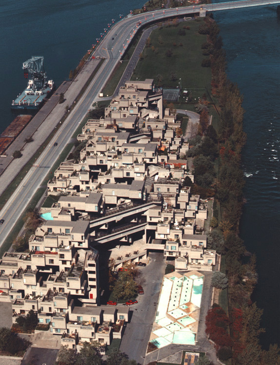 The project originated as Safdie’s thesis at McGill University in 1961, titled “A Case for City Living” and described as “A Three-Dimensional Modular Building System”. Two years later, when he was only 23 and interning in Louis Kahn’s studio, Safdie’s thesis advisor, Sandy Van Ginkel, invited him to submit his project for the World Exposition of 1967. Safdie developed his original theories into a complete master plan which contained shopping centers, a school, and 1000 housing units. The scheme was confirmed, despite Safdie’s young age, but was ultimately reduced by the Canadian government to only 158 residential units.