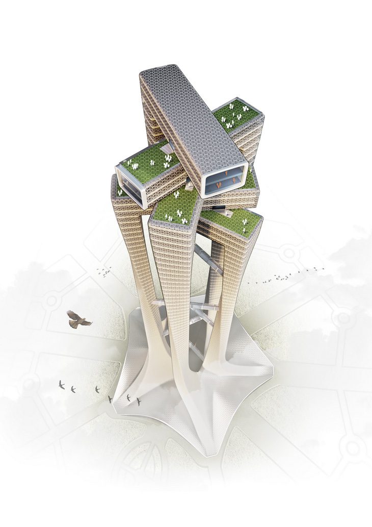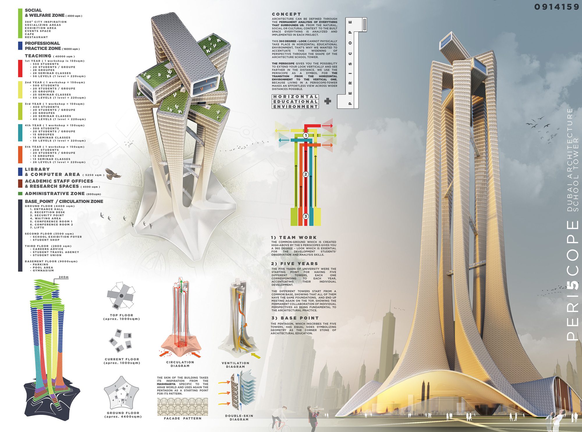 The project PERI5COPE designed as an “Architecture School Tower” by Niculae Grama, Valentin Ionascu, Mihai Chisarau and Marius Pandele from Romania has been chosen as the 2nd Prize winner for the [DUBAI109] competition held and organized by [ AC-CA ] (Architectural Competition Concours d’Architecture).