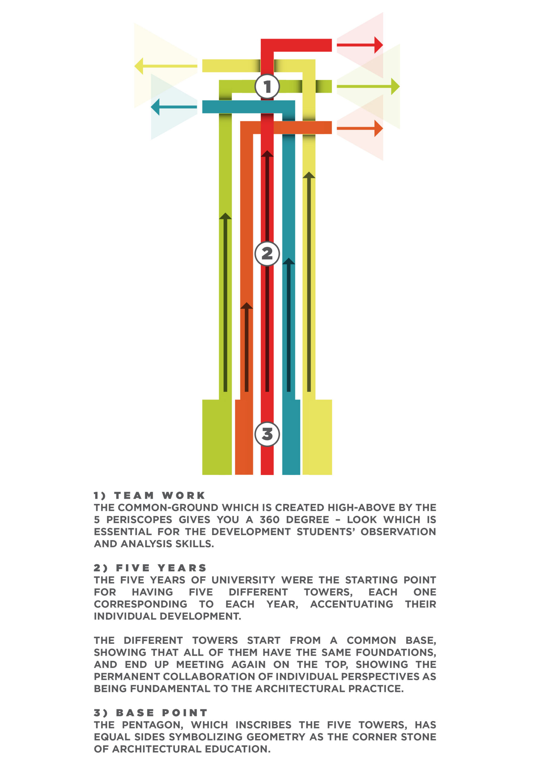 On top of the general ground floor consists of 5 periscope structural towers that allow the 360-degree view to be experienced. This creates a very interesting structural typology that would generally engage and enhance students observation skills. Also, the number of years at a university level, which is five years was also a kind of design factor that propelled the need for five towers. The tower also illustrates the use of individual structures all rooted at the same base, merging with one another to create a kind of unified experience through a collaborative input.