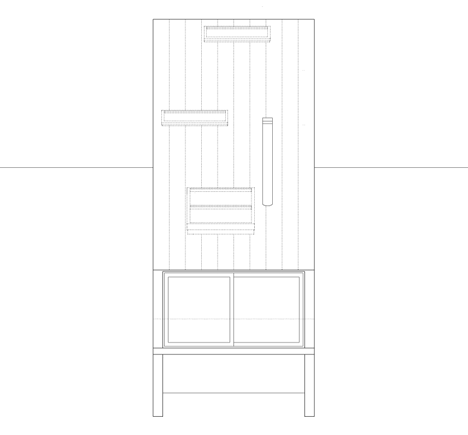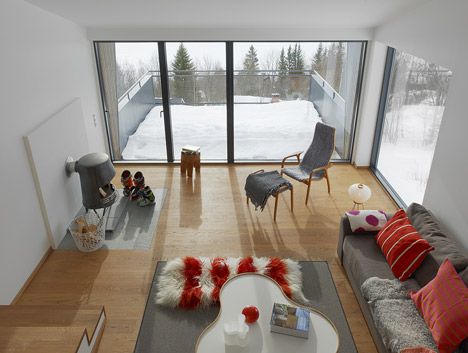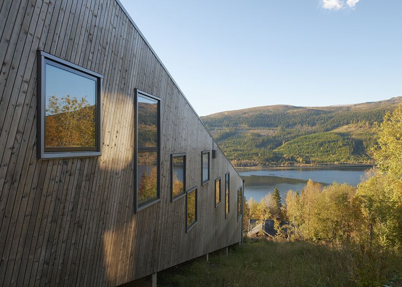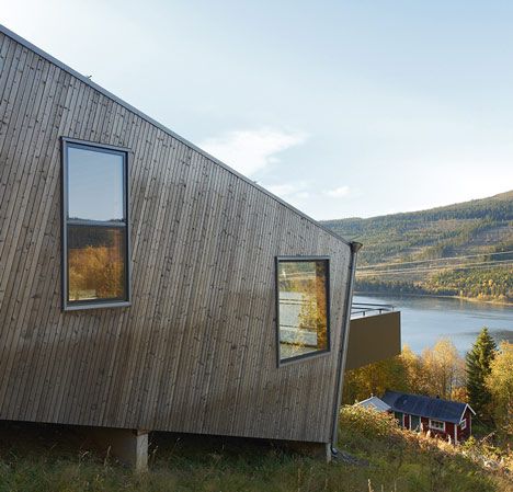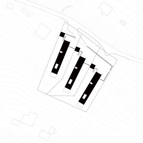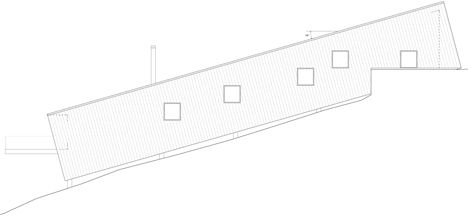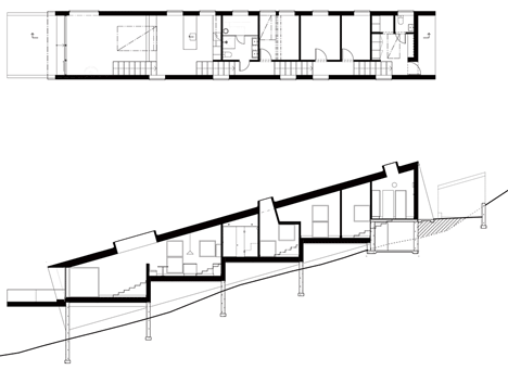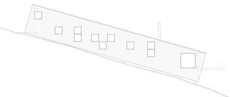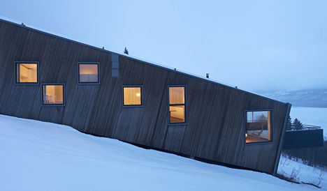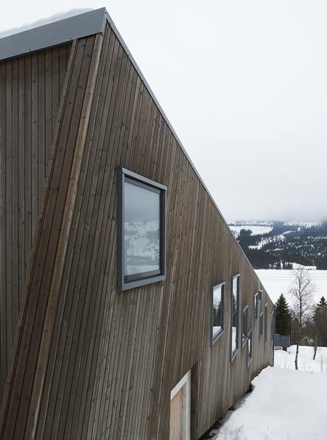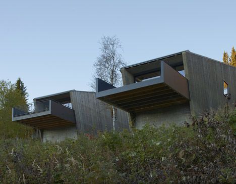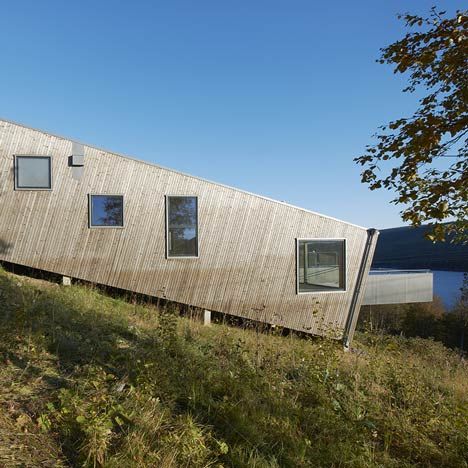 Inside the slanted structure are five tiered floors connected by a single staircase that spans the entire length of each building. Each tier has windows acting as picture frames to the world outside, puncturing through the wooden façade and counteracting the slope of the building. The outdoor terrace is an extension of the lower level of the building, and from the outside can be seen pulled away perpendicular to the ground from the structure without the wooded cladding to emphasis the angle change.