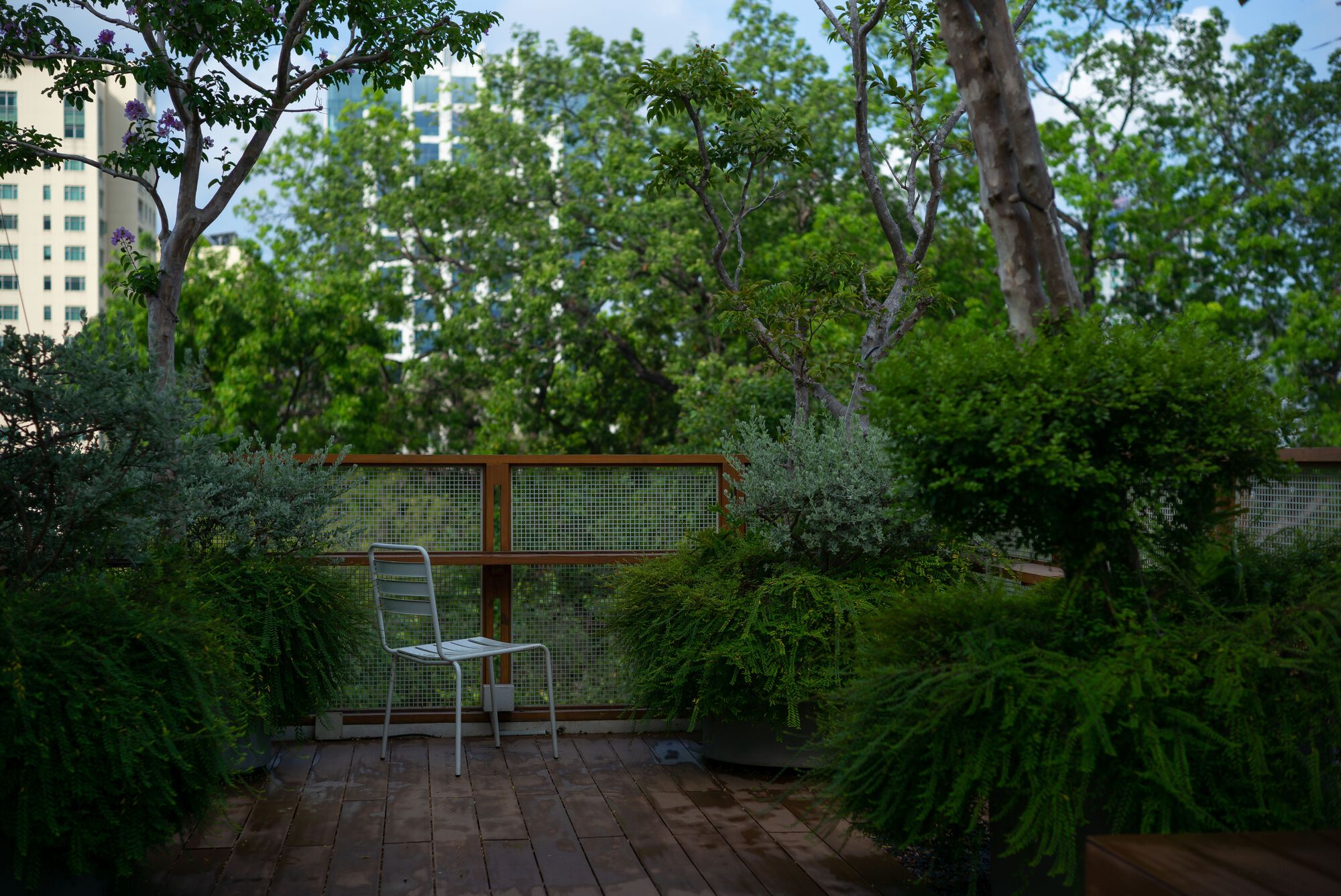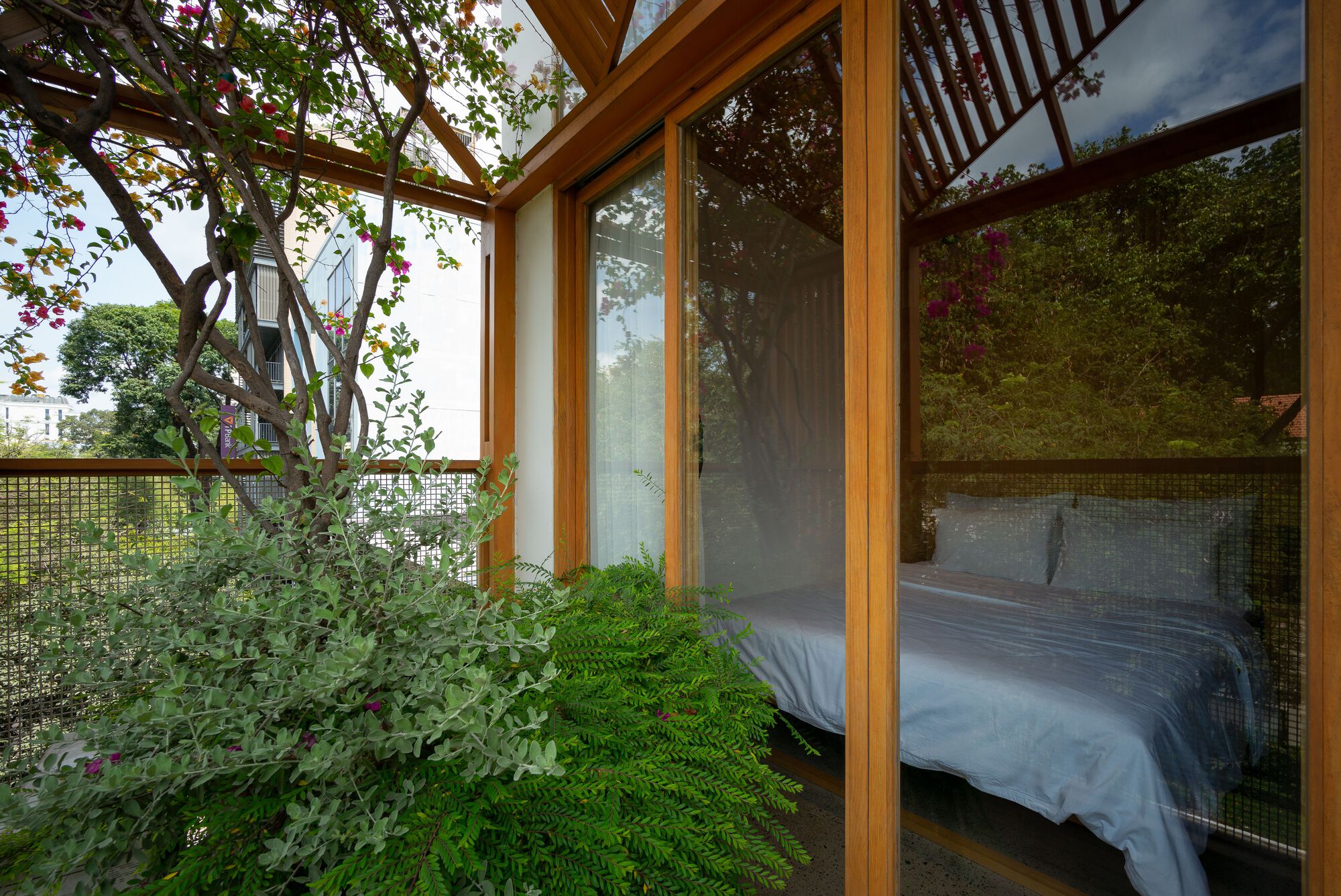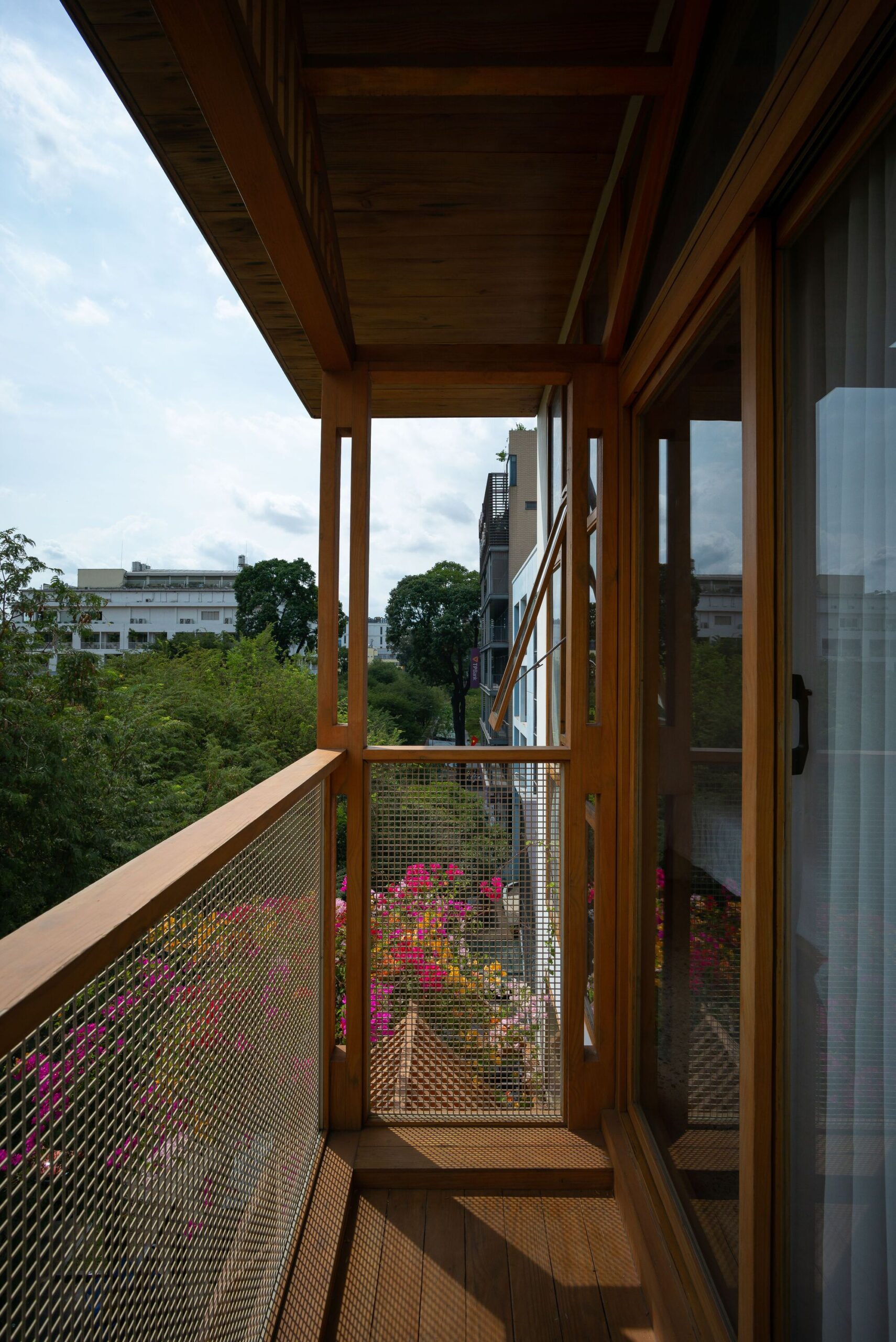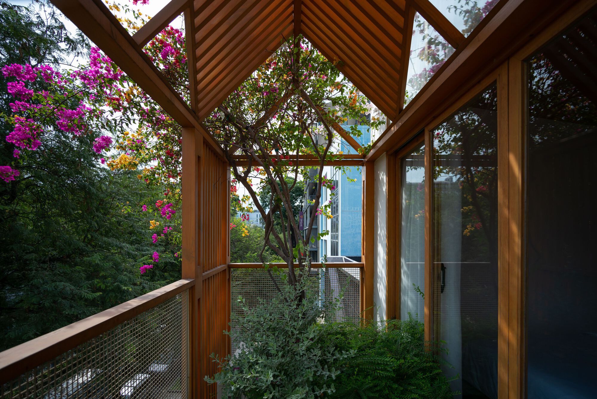 Additionally, the system of wooden slats and trees at the front of the building was regulated and carefully calculated in order to reduce the amount of dust, smoke, and noise from the busy main street, and so as to avoid the direct west sunlight. It not only guarantees privacy but also keeps the interaction of the residents with those big old trees in the front and the greenery of the Independence Palace, one of the most famous historic sites in Ho Chi Minh City, in the south.