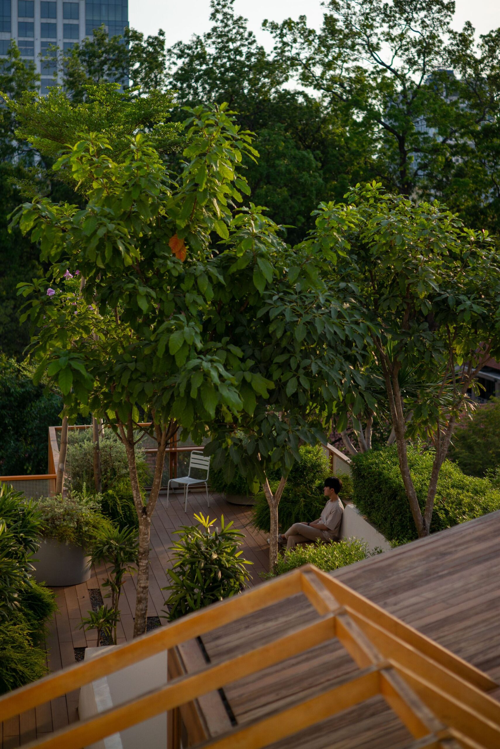 The project is sited on a rare main street that still preserves such long-lived trees, yet the transportation density there is quite large. Instead of pushing the front of the building to the outside, we positioned it backward and created a large porch that suits people living in a tropical climate.