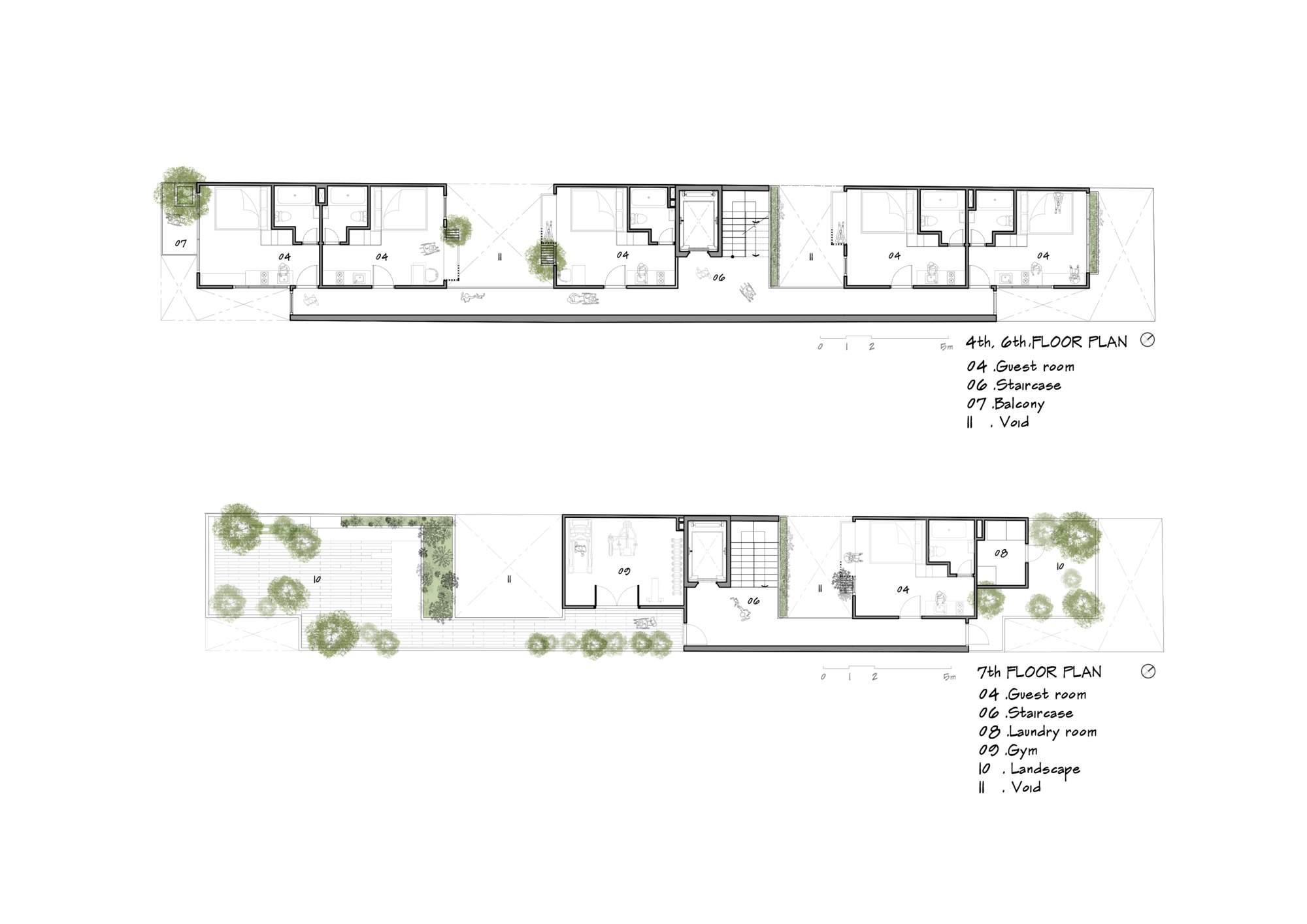 Ariosa Apartments, a serviced apartment serving both long-term and short-term rentals, is located in the center of Saigon where there is the highest construction and transportation density in the country. As the estate covers an area of 210 m2 (5×42), we have to face the common urban problem of the elongated tube houses standing close to each other with a severe lack of light and natural ventilation.