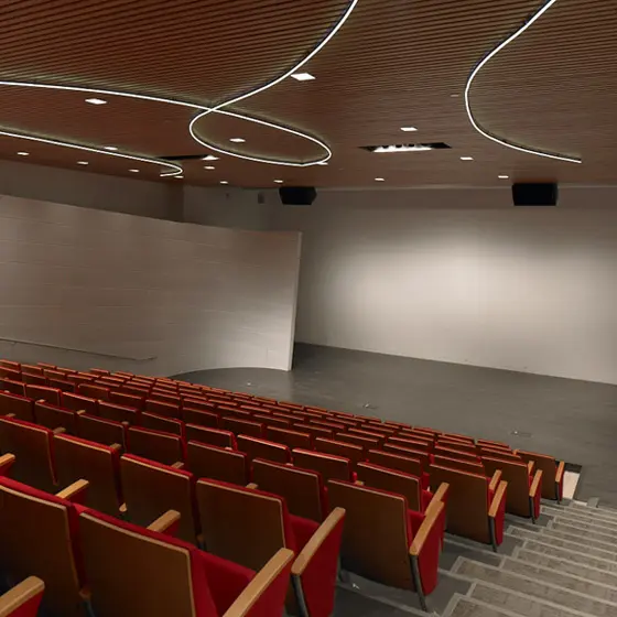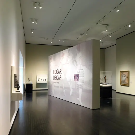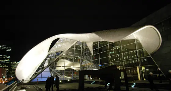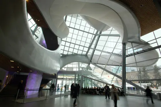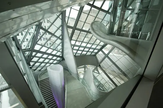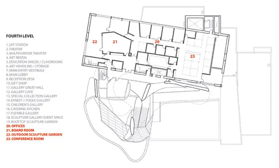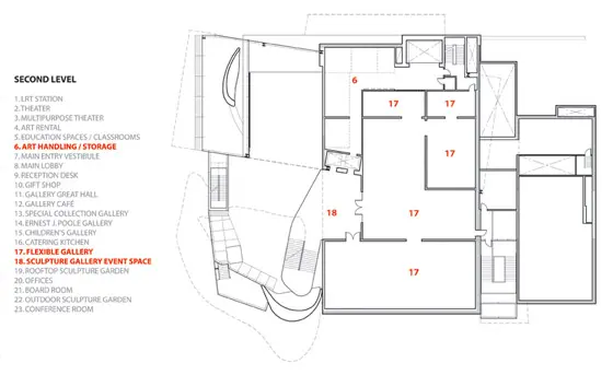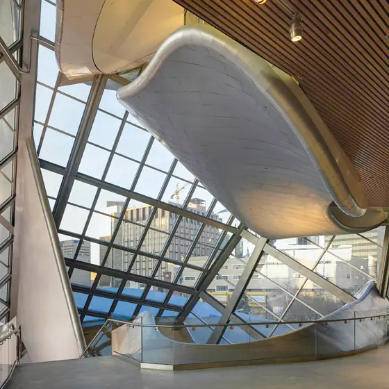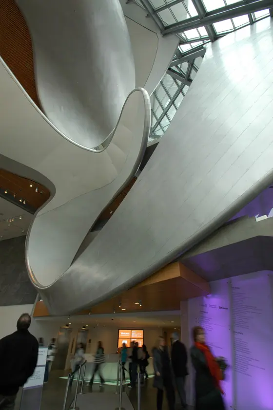 The museum’s public spaces are reinvented in a language of sinuous stainless steel surfaces, peeling off of one another, creating opportunities for generous views and natural light within the building. Wall and ceiling become one fluid surface which captures the spatial volume of the building and guides the public flow through entry points, wrapping event and gathering spaces, and leading up to the galleries. As destinations, the gallery boxes read solid and neutral against the light, dancing forms of the public space.