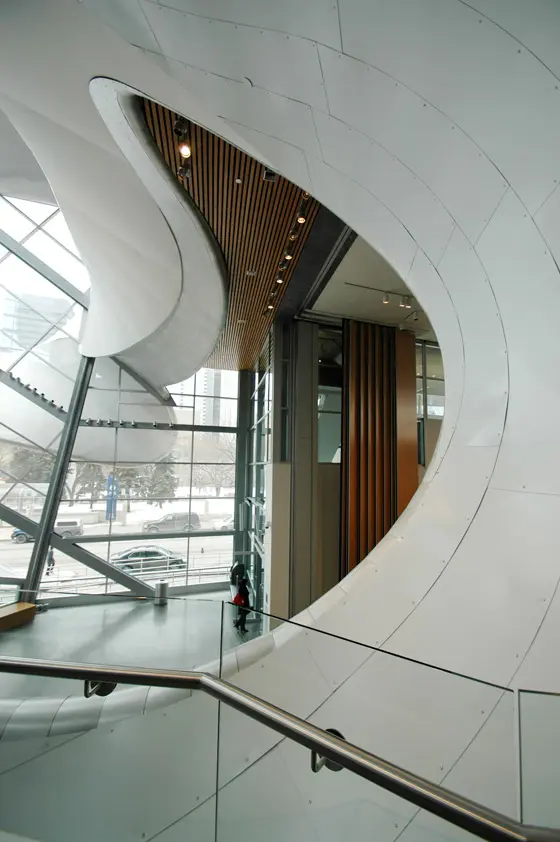 Transparent glazing planes and reflective metal surfaces animate the building, exposing the activities within and engaging people and art at multiple levels on both the interior and exterior. Selected to reflect Edmonton’s dramatic weather patterns and the extreme contrast of the long days of summer and the short days of winter, these materials create a dynamic quality that allow the building to transform along with its natural surroundings. Not only does the building change throughout the day, it changes from season to season. Crafted of patinaed zinc (mined and manufactured in Canada), stainless steel, and high performance glazing, the building will have a timeless appearance and extraordinary durability in the northern climate.