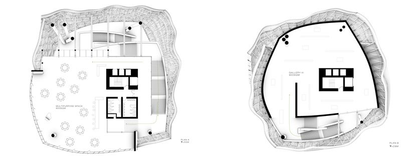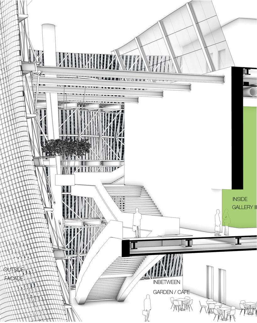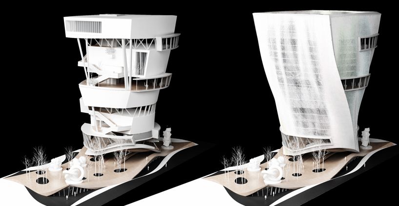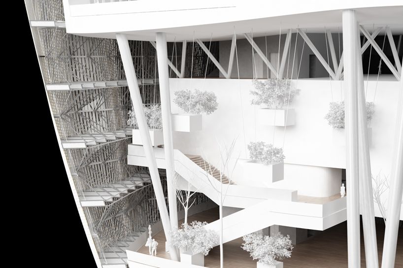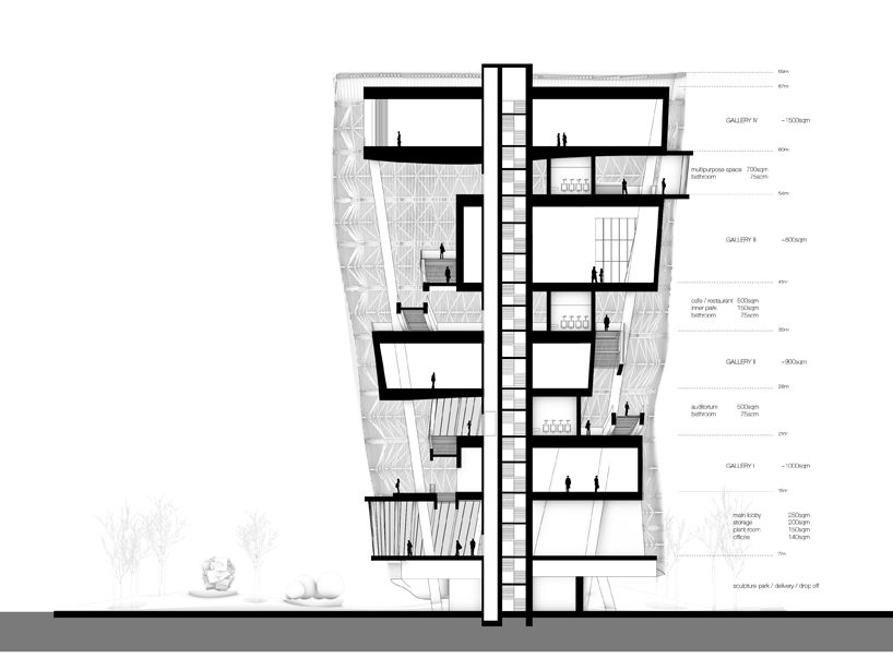 The section is, I think, particularly telling. There are moments of pause interspersed at ‘levels’. At half levels, services and support programs such as WCs and and an auditorium are slotted in. The building’s interesting shape is created no as a stale surface hat happens to be twisting, but as an aesthetically pleasing architectural facsimile of wrapped cloth. It is visible from one of the renders that the facade is, in fact, in an abstract way, appearing to be wrapped around the volume.