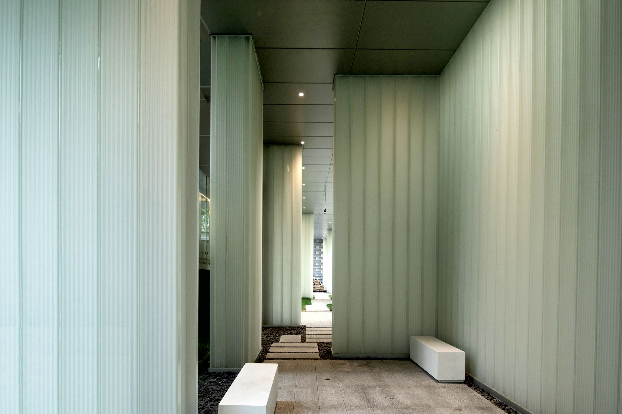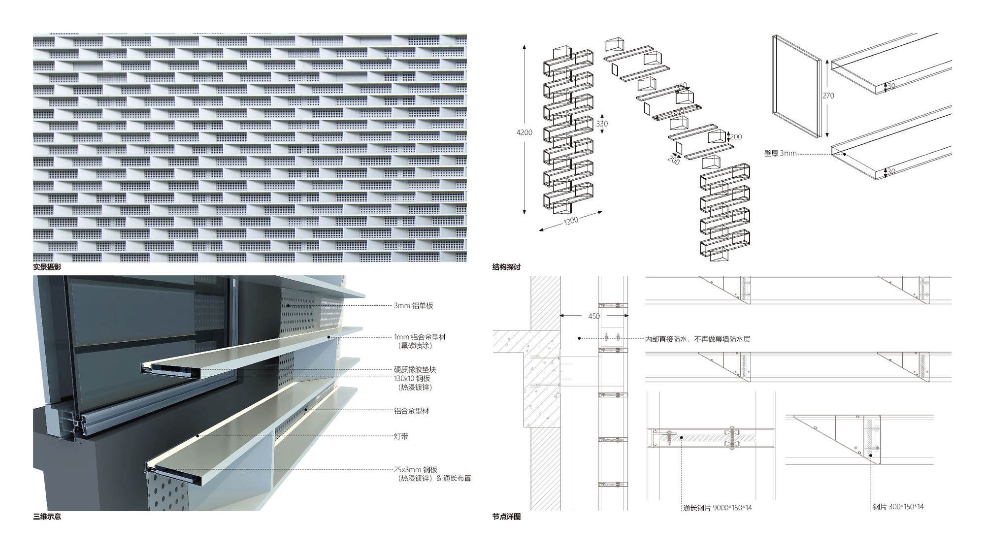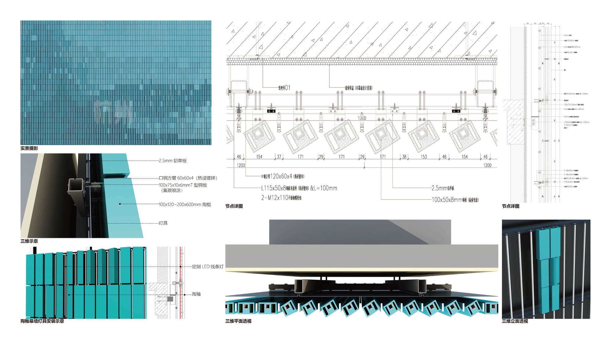 These metal bricks are organized into 300x1200mm modular units that stagger up and down, simulating the traditional masonry pattern of conventional bricks. Furthermore, various unit modules, including hollowed-out, semi-hollowed-out, and physically concentrated elements, are thoughtfully arranged to create a harmonious yet diverse facade. This fusion of features produces a dynamic play of light and shadow, ultimately realizing the rhythmic city wall concept.