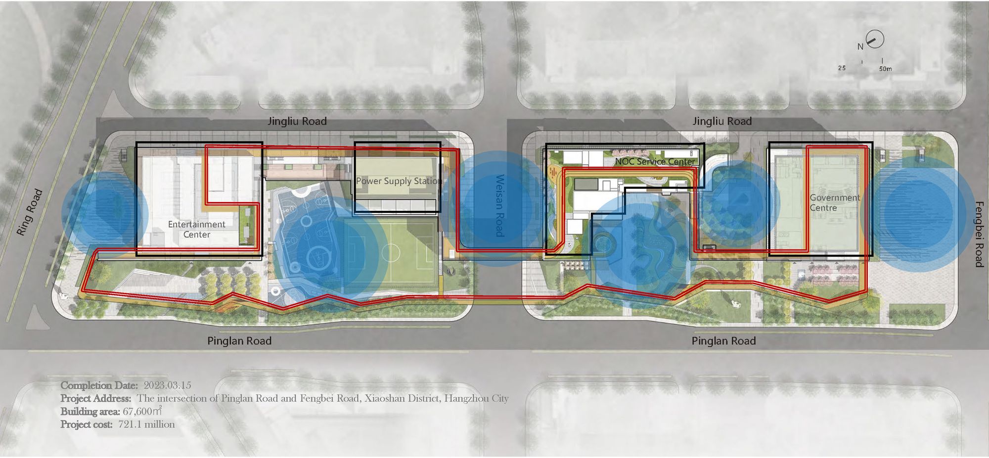 The area is strategically designed as the critical public activity space within the functional structure of the Asian Games Athlete Village, serving as a prominent showcase for the city during the event. These buildings are designed to fulfill essential support roles during the Asian Games. They will transform post-event into large public structures catering to the city’s evolving cultural, art, and public space needs.