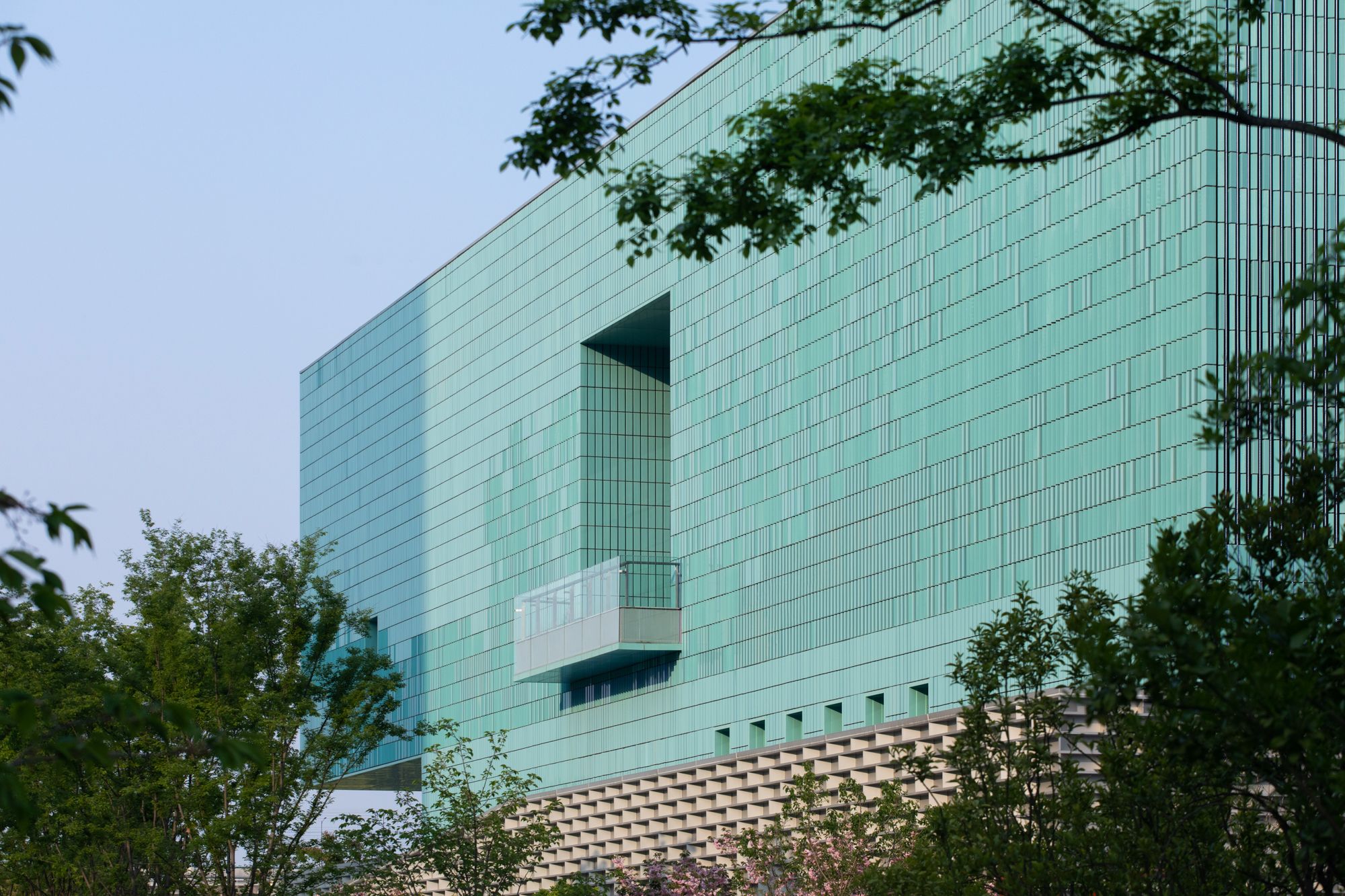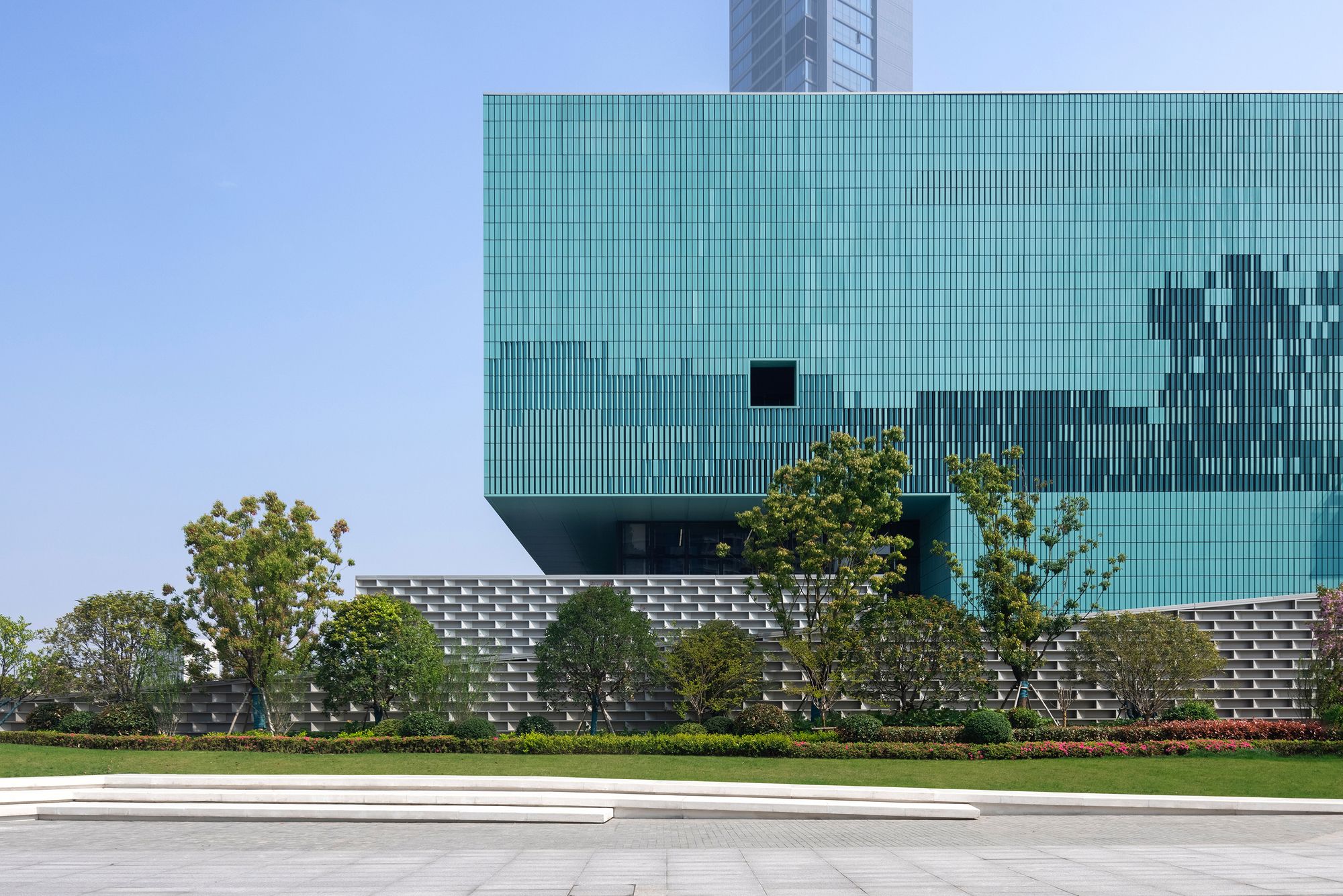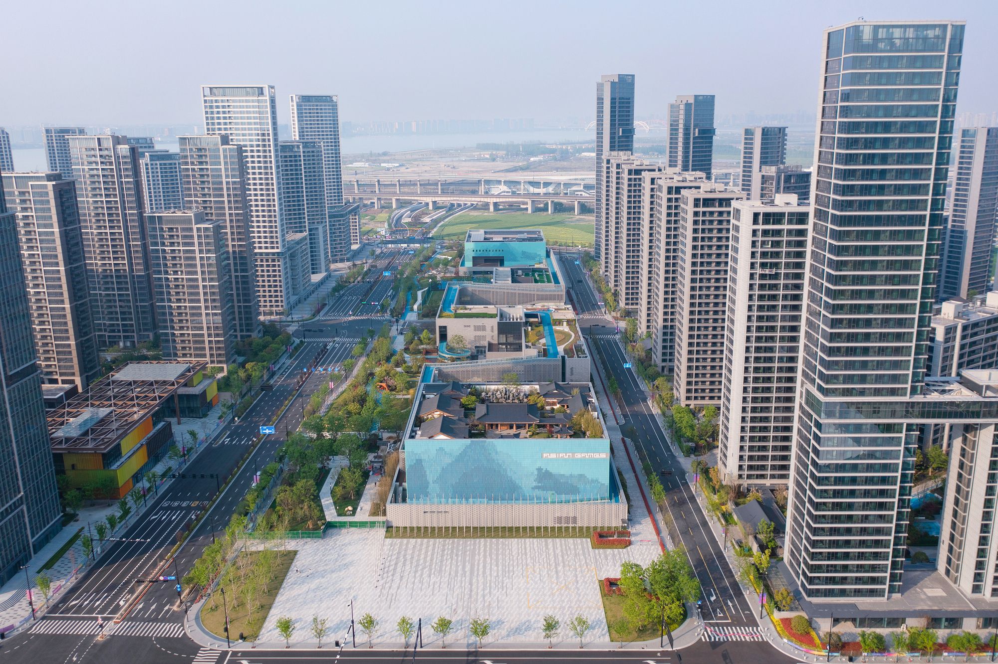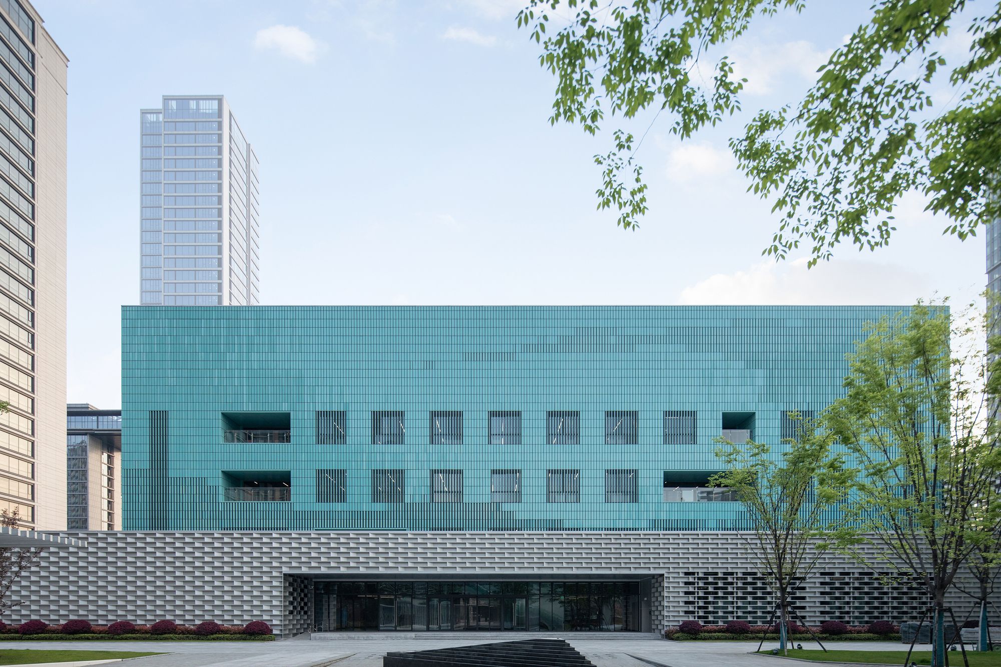 The design approach also considers the significance of “Dwelling in the Fuchun Mountains” as a representation of Chinese traditional culture. Notably, the original artwork is divided into two parts stored on opposite sides of a strait. In a symbolic gesture of unity and well-wishing, the design combines these parts into one cohesive facade. The selection of exterior wall materials for this facade section involved numerous experiments, ultimately leading to the choice of turquoise pottery clay louver blades as the primary materials. The glazed facade achieves both a celadon color and a sensation of jade-like warmth and smoothness. The complex landscape map transforms into four unit modules, leveraging digital design methods.