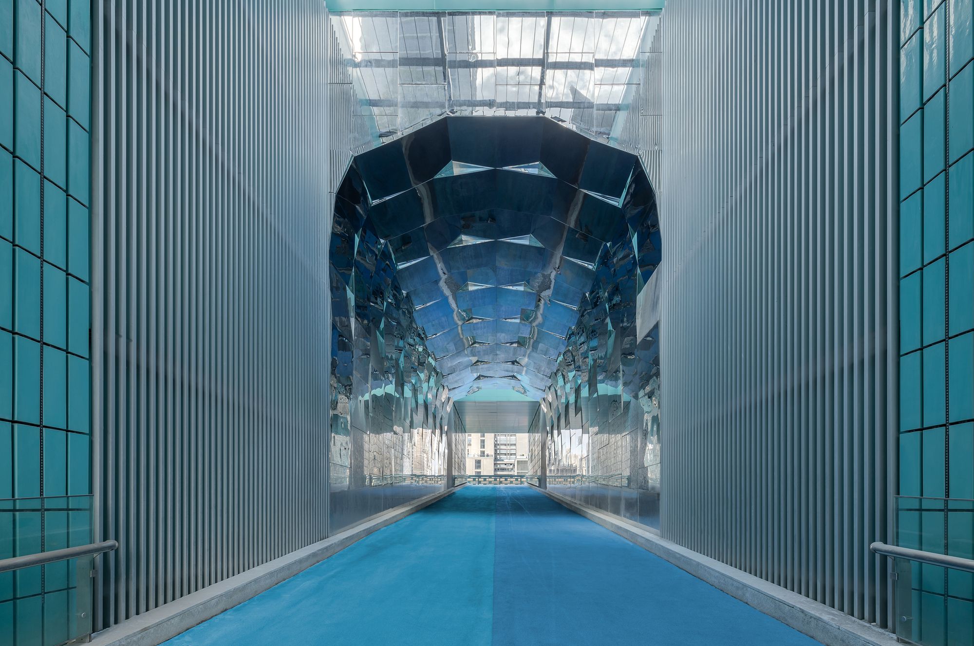 The second aspect involves creating multiple scenes that undergo mutual transformation, resulting in a phenomenon called “view changing as people walk.” Sets are thoughtfully designed based on their functions and locations, tailored to the specific context, and linked consecutively along the travel route. For instance, a series of remarkable spaces are strategically placed along this journey. These spaces include magical tunnels that weave through The Asian Games Athlete Village, spiraling circular ramps, rooftop garden stations for brief stopovers, narrow alleys between city walls, imposing stadium screens enveloping substations, and spectator stands seamlessly integrated within the Asian Games Athlete Village.