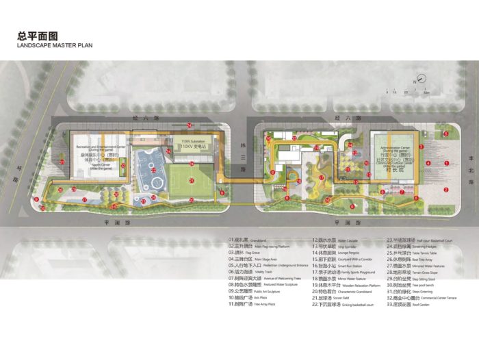 The Asian Games Athlete Village’s scope extends beyond the immediate requirements for hosting the Asian Games Athlete Village activities. It must also consider its functional transition post-event. Moreover, the site, bisected by urban thoroughfares, hosts critical urban infrastructure like a substantial substation and concurrent subway construction. In response to these complex conditions, the design strategy involves unifying these components coherently. This integration seamlessly combines the sports park, subway system, substation, and other infrastructure, epitomizing a holistic approach to architecture and landscape design from a city-centric perspective.
