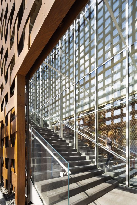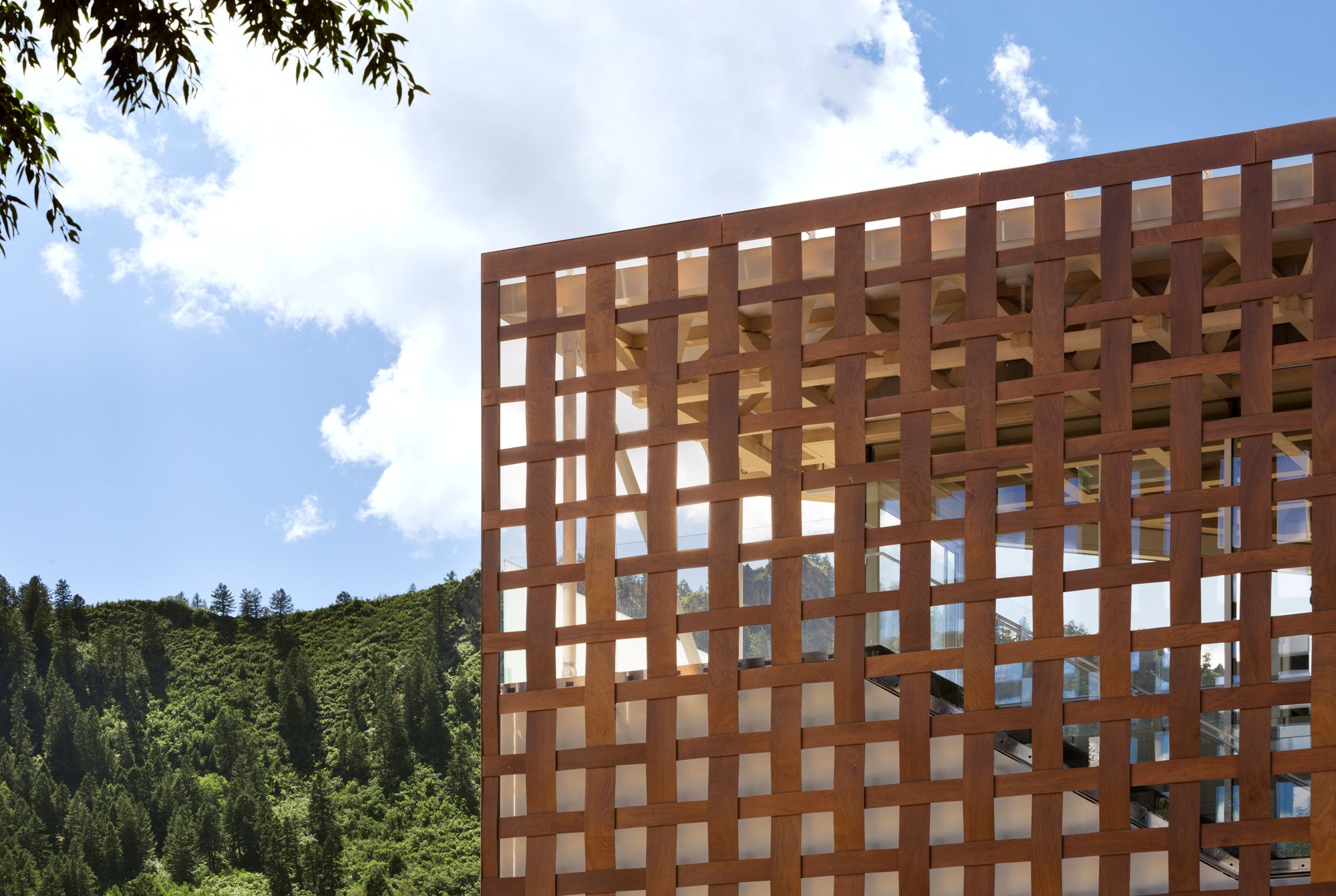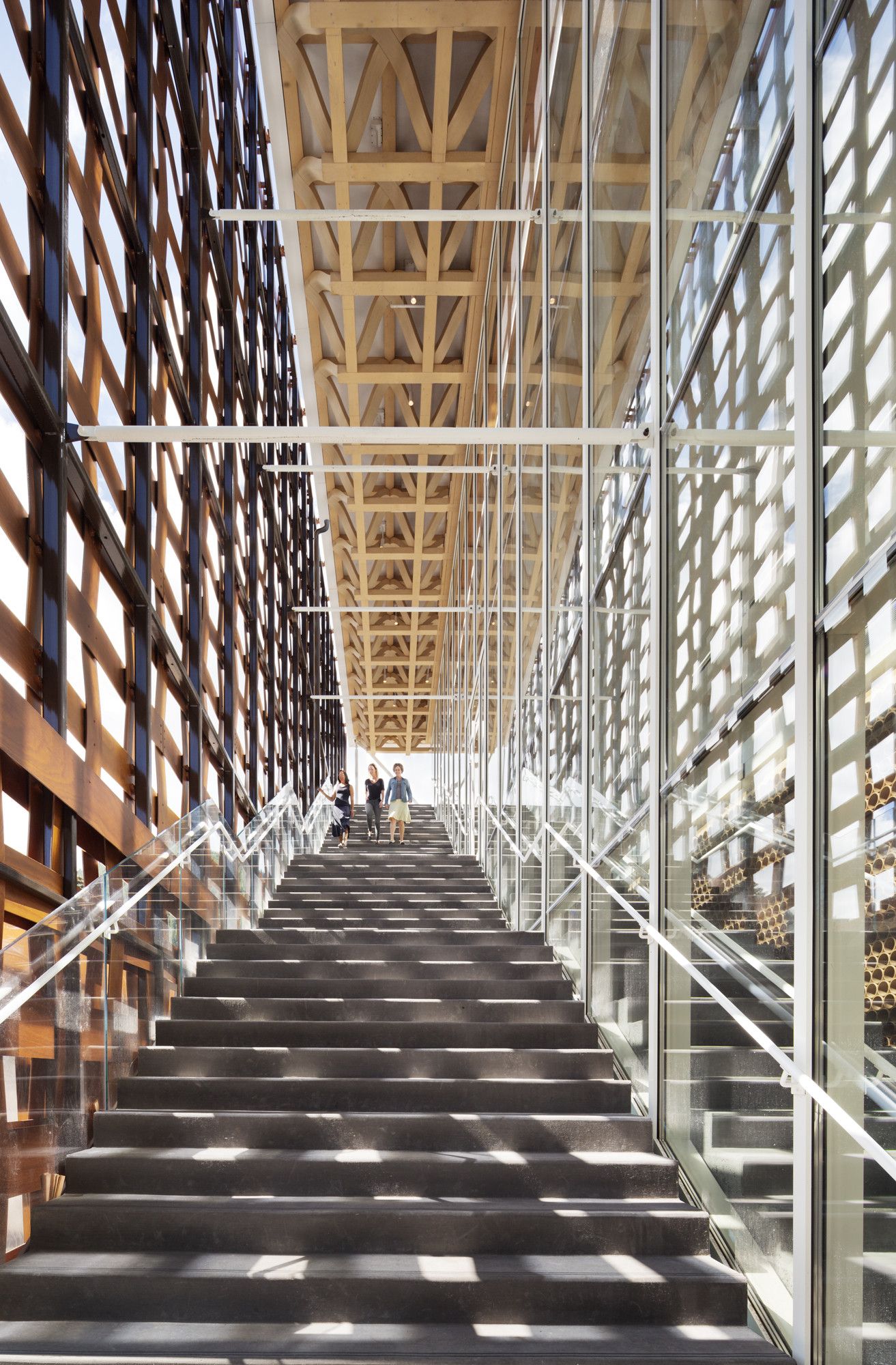 The main entrance of Aspen Art Museum is located on the north side of the building along East Hyman Avenue, which allows access to the reception area and two ground-floor galleries. From there, visitors may choose their path through museum spaces—ascending to upper levels either via Ban’s Moving Room glass elevator in the northeast corner, or the Grand Stair on the east side. The Grand Stair—a three-level passageway between the building’s woven exterior screen and its interior structure—is intersected by a glass wall dividing it into a ten-foot-wide exterior space and a six-foot-wide interior space. The unique passage allows for the natural blending of outdoor and indoor spaces, and will also feature mobile pedestals for exhibiting art. The exterior Woven Wood Screen for Aspen Art Museum is made of the composite material Prodema—an amalgam of paper and resin encased within a dual-sided wood veneer.