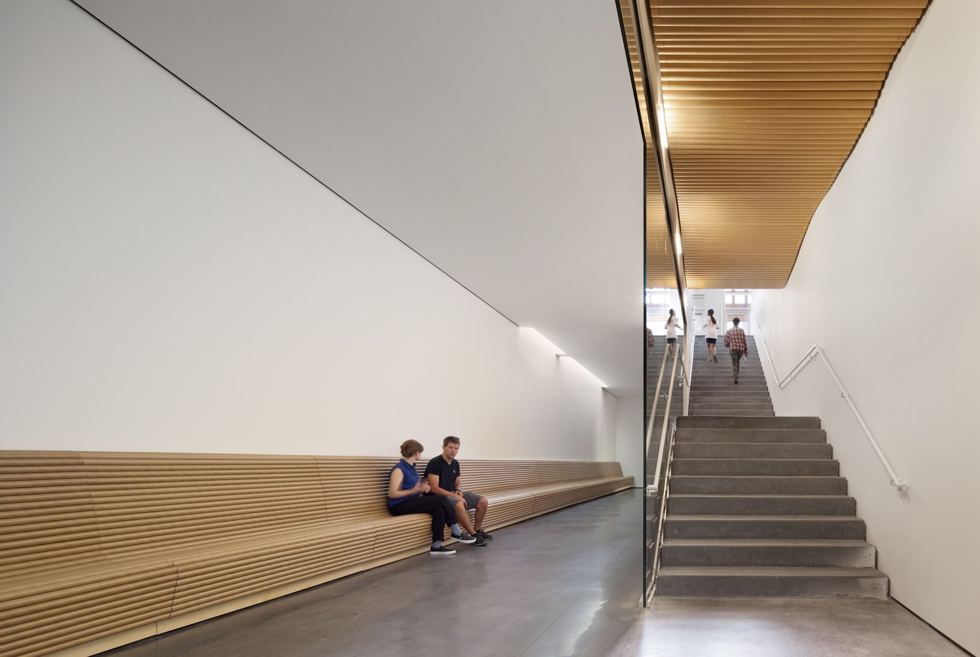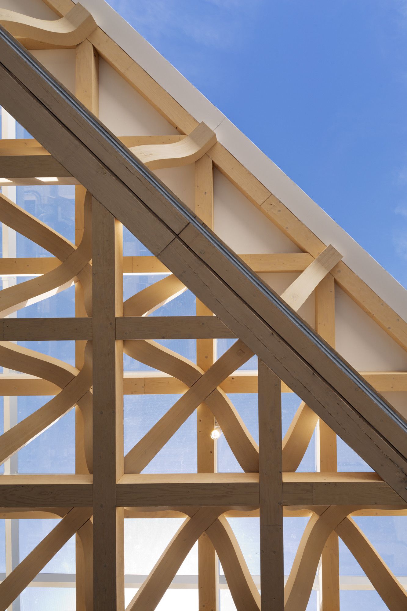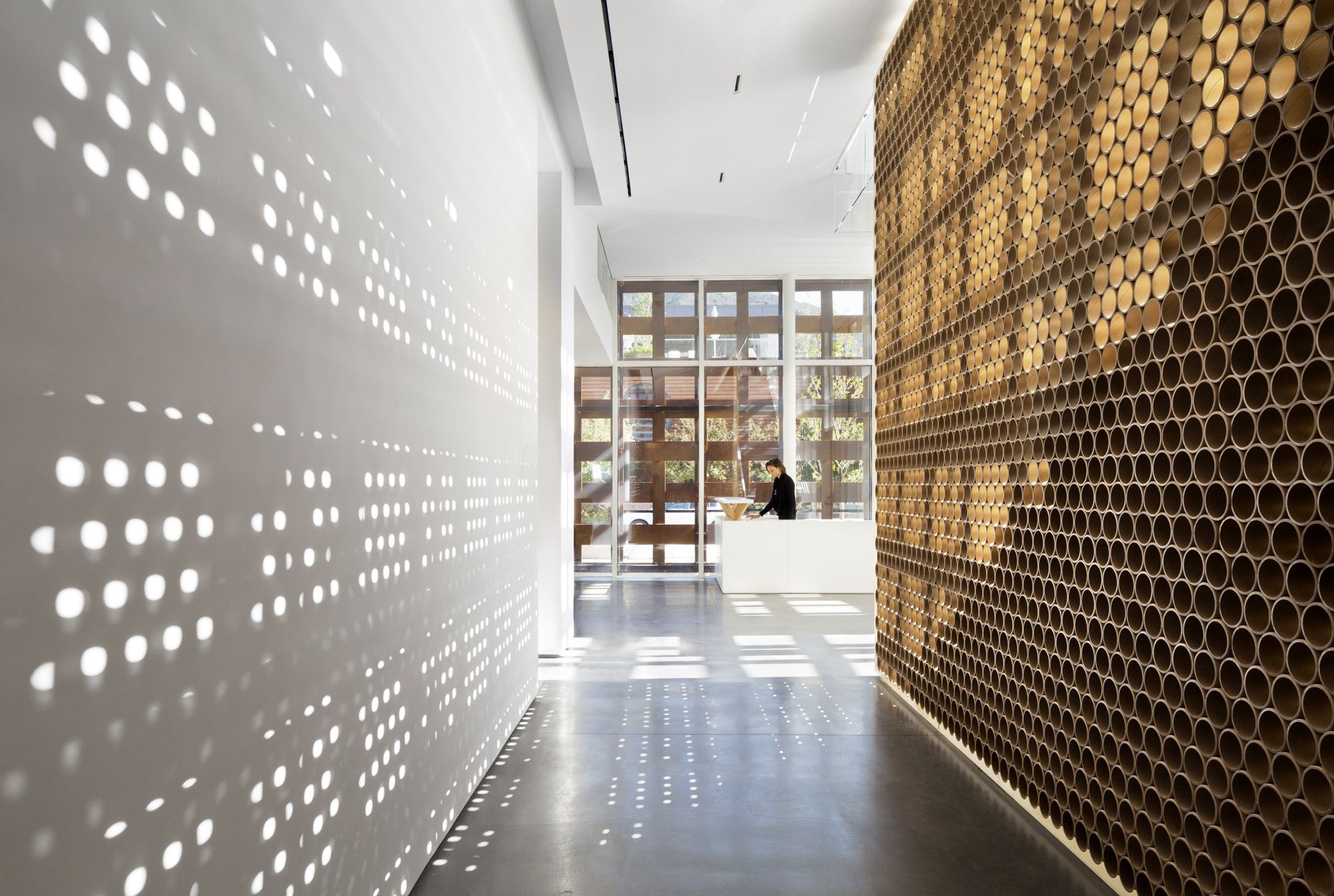 The main entrance of Aspen Art Museum is located on the north side of the building along East Hyman Avenue, which allows access to the reception area and two ground-floor galleries. From there, visitors may choose their path through museum spaces—ascending to upper levels either via Ban’s Moving Room glass elevator in the northeast corner, or the Grand Stair on the east side. The Grand Stair—a three-level passageway between the building’s woven exterior screen and its interior structure—is intersected by a glass wall dividing it into a ten-foot-wide exterior space and a six-foot-wide interior space. The unique passage allows for the natural blending of outdoor and indoor spaces, and will also feature mobile pedestals for exhibiting art. The exterior Woven Wood Screen for Aspen Art Museum is made of the composite material Prodema—an amalgam of paper and resin encased within a dual-sided wood veneer.