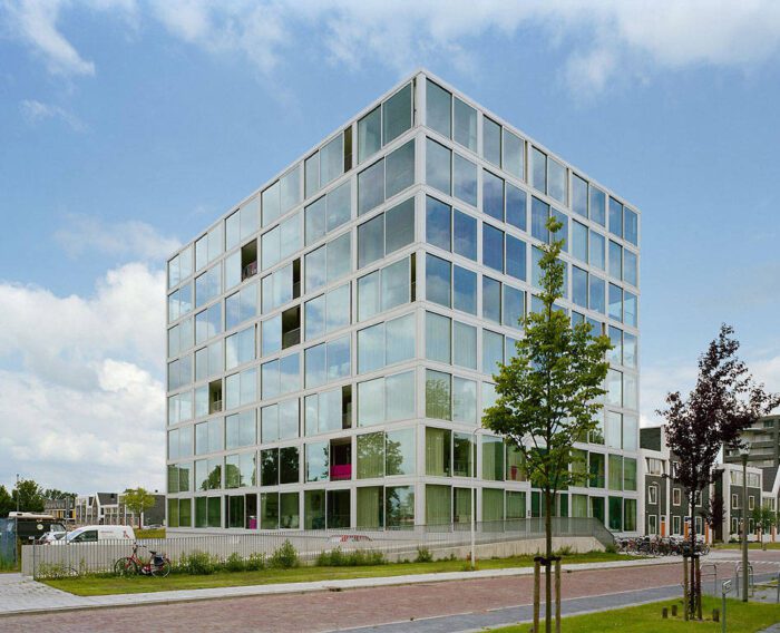 The building block, measuring 23m x 32m and providing 8 units per floor, has a very limited facade surface in relation to its floor area; this favorably affects building costs and enables the high-quality detailing of the facade. The housing units are organized around a central core containing a double stair and an elevator. The plan layout allocates the larger apartments to the spatially interesting corners, thus creating apartments with double orientation. The smaller studio apartments either face east or west, guaranteeing optimum sunlight for all apartments. To compensate for its volumetric compactness, the building’s surface is consistently glazed. Anodized aluminum profiles hold the high-quality solar-protection glazing to form the facade. Depending on the viewer’s position the building appears to be covered by a transparent skin or a reflective surface; furthermore, sliding doors provide generously dimensioned facade openings.