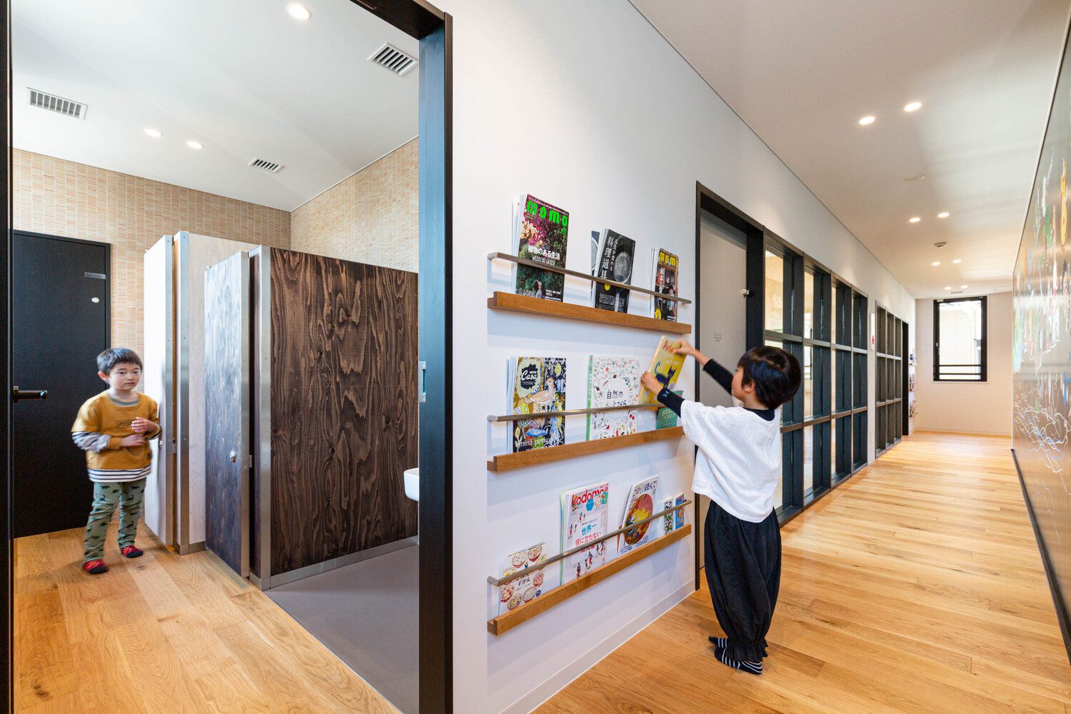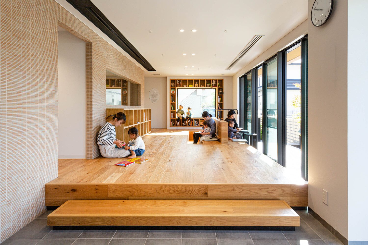 The facility offers a variety of spaces. The entrance, “Doma Space,” invites parents they casually drop in. The raised platform, “Koagari Space,” engages children’s senses. The “Atelier Space” flourishes children’s imagination. The “Play Space” strengthens children’s physical health. The “Multi-purpose Space” lets parents and children encounter various topics that they may never have known. Since the building is dedicated to childcare support, it is always available to the public during open hours, and the full commitment by staff members with specialized qualifications in child-rearing is always available to guide people in need. With that, people can freely come in and make full use of the facility.