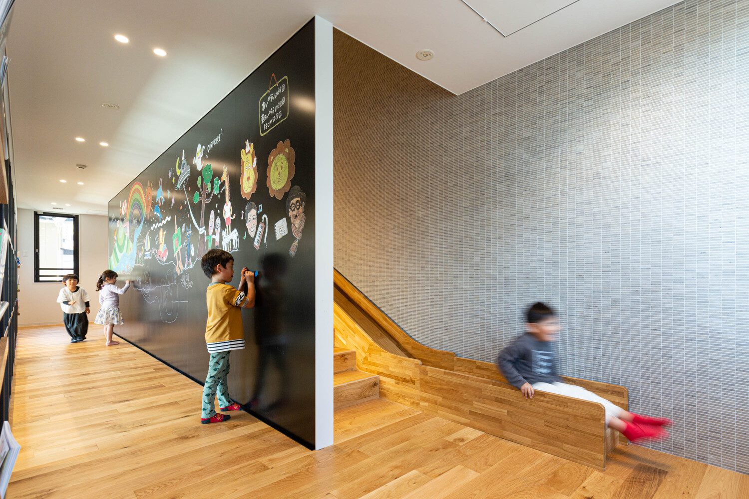 This is a newly constructed childcare support facility built across the road from an existing kindergarten that has served the local community for 65 years. Continuing the long commitment to the local community, this new childcare support facility will connect children, parents, and the local community and work towards an environment that comprehensively supports parenting to a greater extent. The facility is free of charge, open every day except weekends and holidays, and accessible to the public.