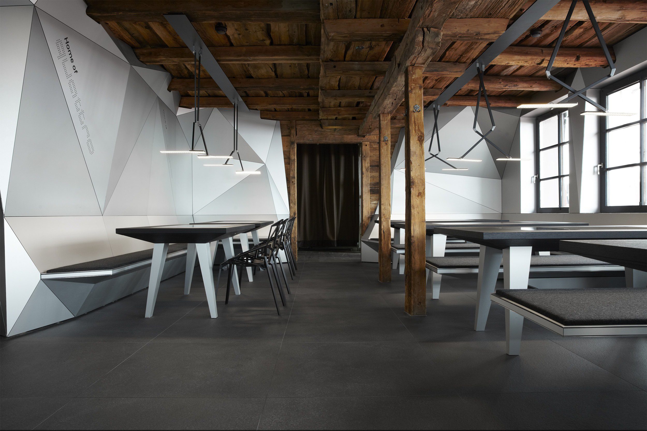The portion of the host space, which lies behind the aluminium facade, together with its faceted interior walls of a maximum contrast to the existing interior of the hut, balance the small piece of wood surfaces with the large geometric aluminium. The decoration of the heating stove is inspired by parts of traditional mountain hut interiors, but incoporates them with elements influenced from the history of the Quattro. Instead of a traditional stag’s head, the stove features a 3D sintered model of a gecko which represents an emblem of the Quattro advanced technology.