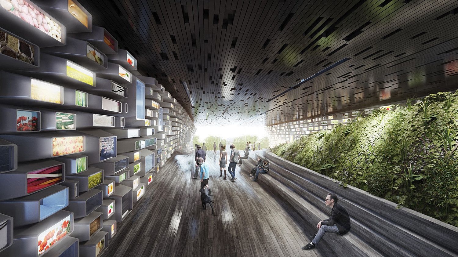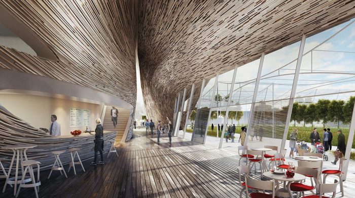 Highlighting the local cultural and craft diversity within Australian regions and the area’s diverse topography, the design resembles an ark of sorts. Within this ark not only is there a broad variety of agricultural crops and goods, but there is also a strong showcase for sustainability. The pavilion is organized as a two story building comprised of a pair of elongated volumes.