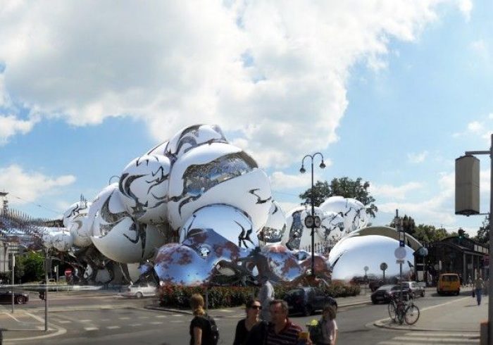 It evolves as if painting and sculptures are melting and flowing out of existing MAK museum, Crafting and blending in surrounding landscape of stadtpark, and creating a new music house.”