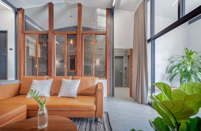 The exterior of the architecture has an outstanding look with the lines for a smooth feeling. But at the same time, it also feels friendly with the surrounding by choosing to use the simple materials to be the building’s frame which is produced in Saraburi. The combination if color schemes were created by various materials, blends well with this street and retains the shape, taste, smell, and sound of the pounding with architecture.