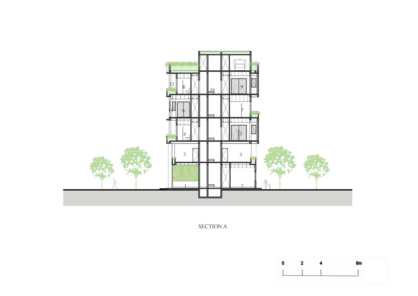 Babylon Garden’s location in the alley off Ha Bong was at first not favorable because the land is surrounded on 3 sides with old residential low-rise buildings. The solution by Ho Khue Architects (ALPES Green Design & Build) was to build high, include a combination of reflective glass, balconies, and plantings. It is natural among concrete.