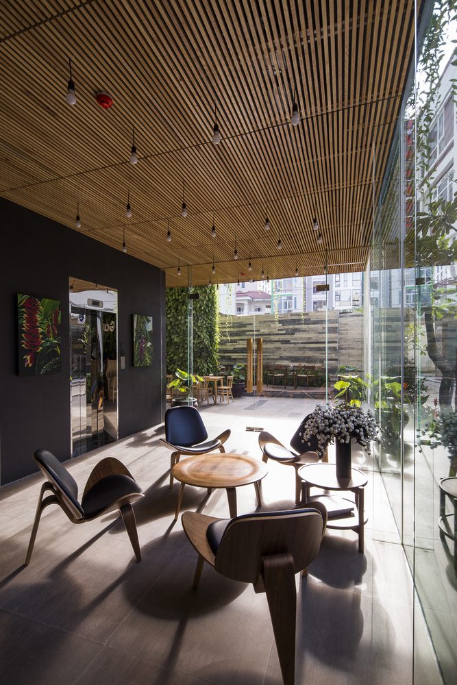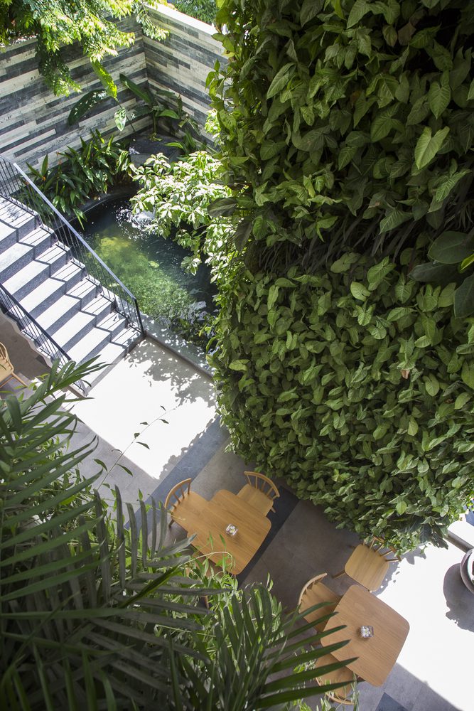 The 1st floor and mezzanine has floor up plantings and vining plants hanging from the restaurant planters on the second floor. Specialized vertical planting cases are used to accomplish this beautiful effect. The frontal area is cramped by the alley, yet the view and feeling inside are expanded by the vertical plantings, Koi Lake, natural ventilation on the back wall, and very high ceiling. Everyone recognizes an unusual or soothing architectural landscape. We feel them unconsciously. Ho Khue Architects (ALPES) requires that our projects satisfy light and ventilation requirements in addition to creating landmark high-rise buildings in urban spaces that elicit feelings