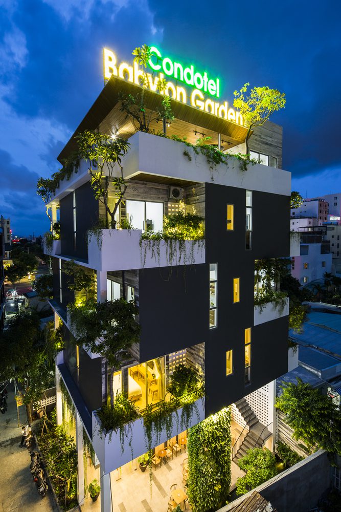 Each bedroom is attached to a relaxing balcony that houses a large variety of trees and a balustrade, which changes its position with each floor. The “dancing” of the balconies around the building offers an unusual beauty we feel as motion. Ho Khue Architects (ALPES) wants to build great and strong buildings that also focus on the emotions of users. Incorporating trees and plants with natural stone and decorative concrete contribute to elicit a positive perception of the buildings as a natural environment. Babylon Garden is a modern hanging garden that connects people with nature, just steps from the hustle and bustle of the tourist area.