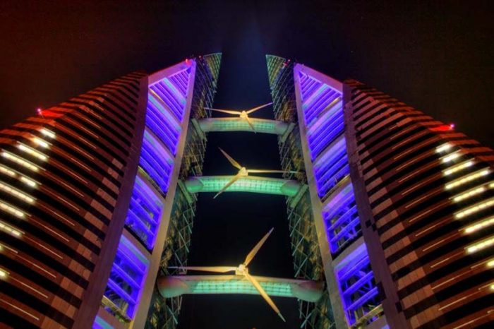 The Bahrain World Trade Center stands as an icon of sustainable design and engineering. The building includes the first installation of large-scale wind turbines into a commercial building.