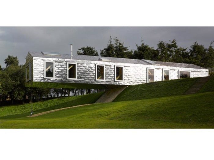 The Barn’s metal facade reflects its natural surroundings and the changing seasons. On entering, one steps into a kitchen and a large dining room. In the inside, it consists of four double bedrooms, each with separate bathroom and a toilet. In the very center of the barn, the bedroom sequence is interrupted by a hidden staircase providing access to the garden beneath. In end of the barn, is a large living space with windows in three of its walls, floor and ceiling. Full height sliding windows and roof lights throughout the house ensure continuous views of, access to and connectivity with nature. The Barn is highly insulated, ventilated by a heat recovery system and heated by a ground source heat pump, resulting in a highly energy efficient building.