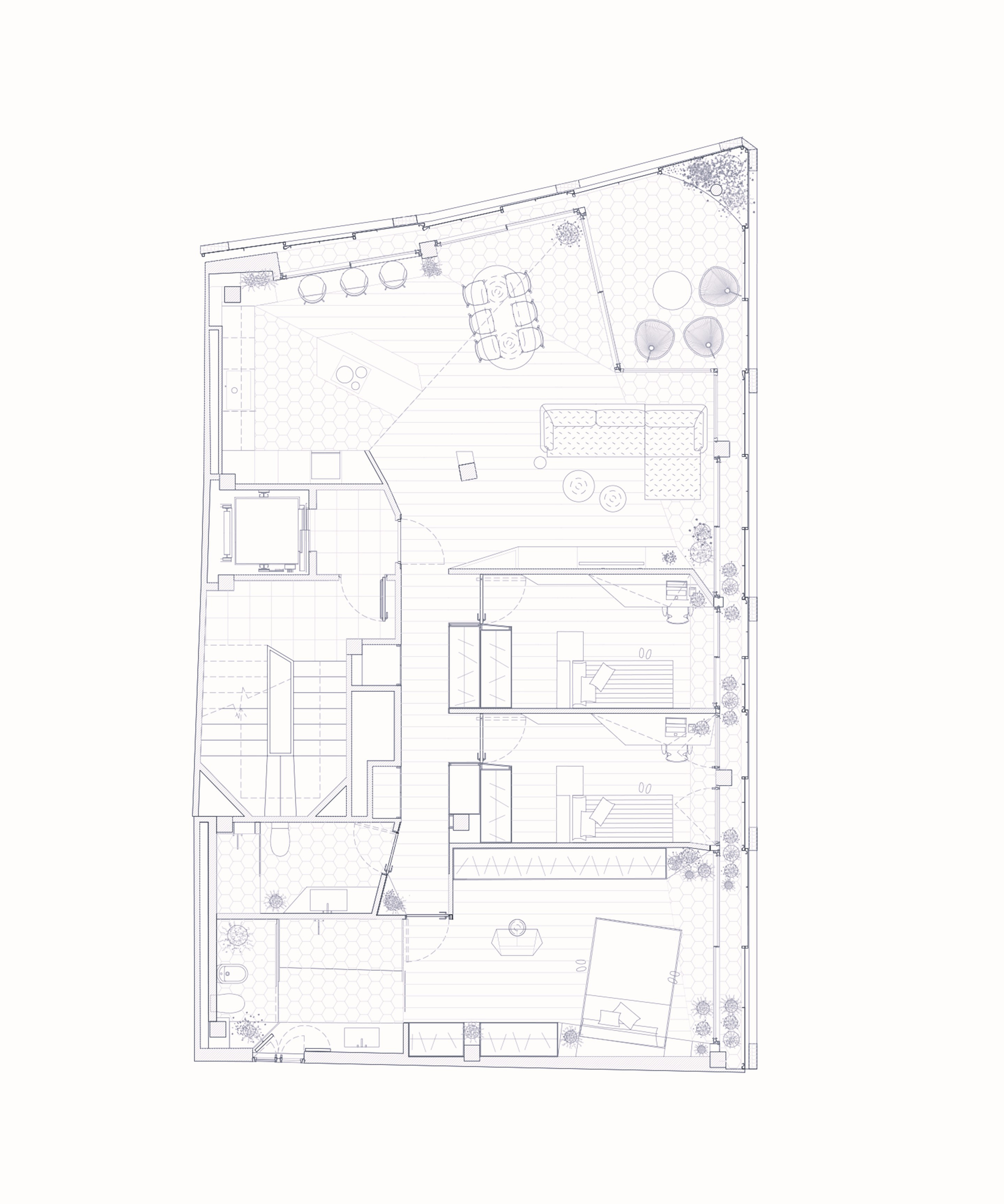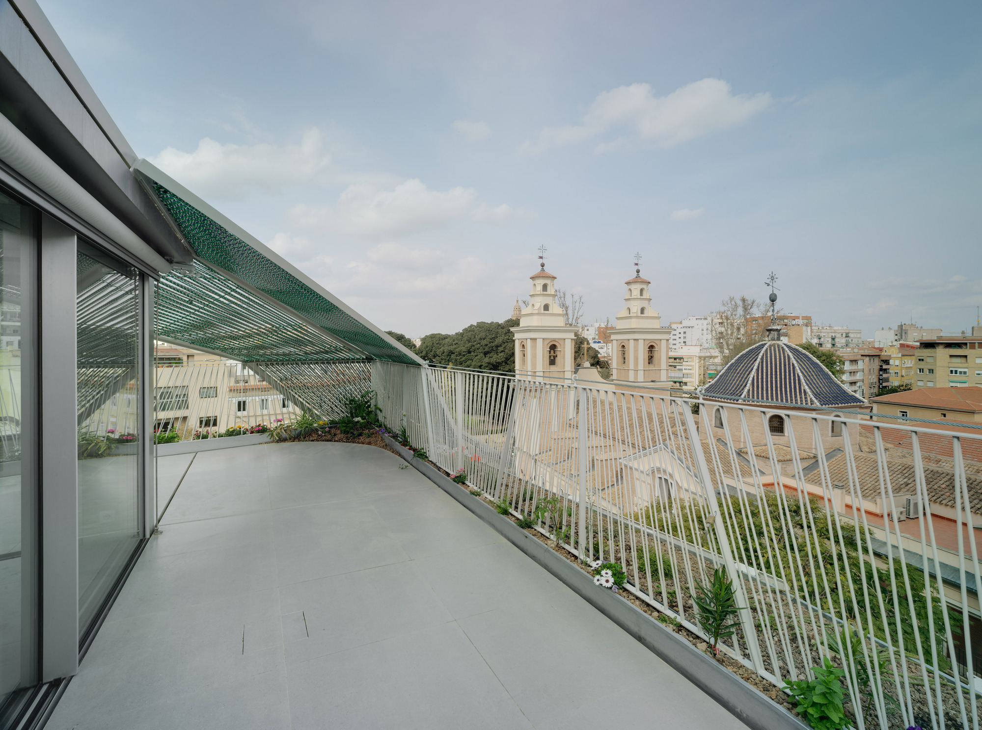 Environmental Sustainability. Biophilia. In order to recover the ecological relationship with nature and its benefits for well-being, new infrastructures related to the support of plants are added, as well as the use of natural colors and materials. On the top floor terraces, a garden of native species is placed with the aim of promoting biodiversity and reducing the heat island effect in the city.