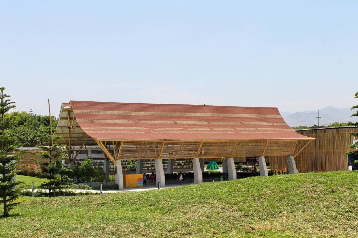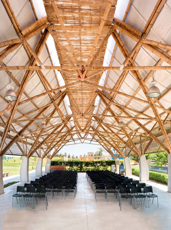 On the lateral parts of the auditorium, blinds made of the phyllostachys bamboo species were installed to provide sun protection and to form a skin that mimics the other pavilions in the park. The three-dimensional structure is composed of simple elements that were prefabricated on the floor and assembled thanks to spatially designed metal connectors, managing to finish the work in less than 3 months. The construction of this emblematic building in the city of Lima was made possible by the support of the International Bamboo and Rattan Organization – INBAR.