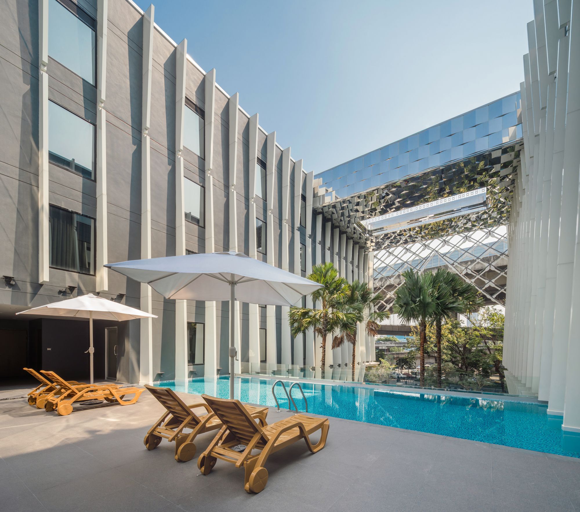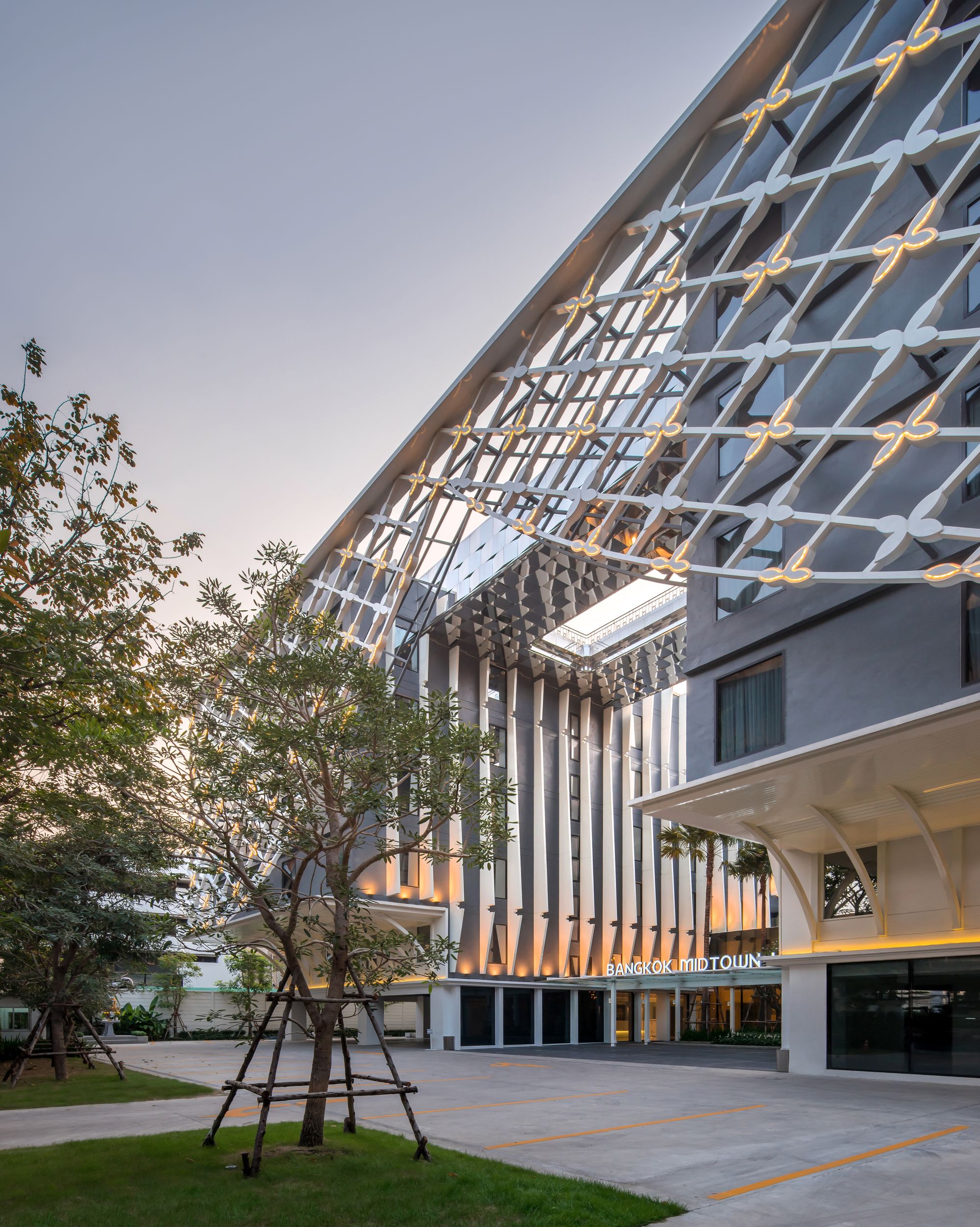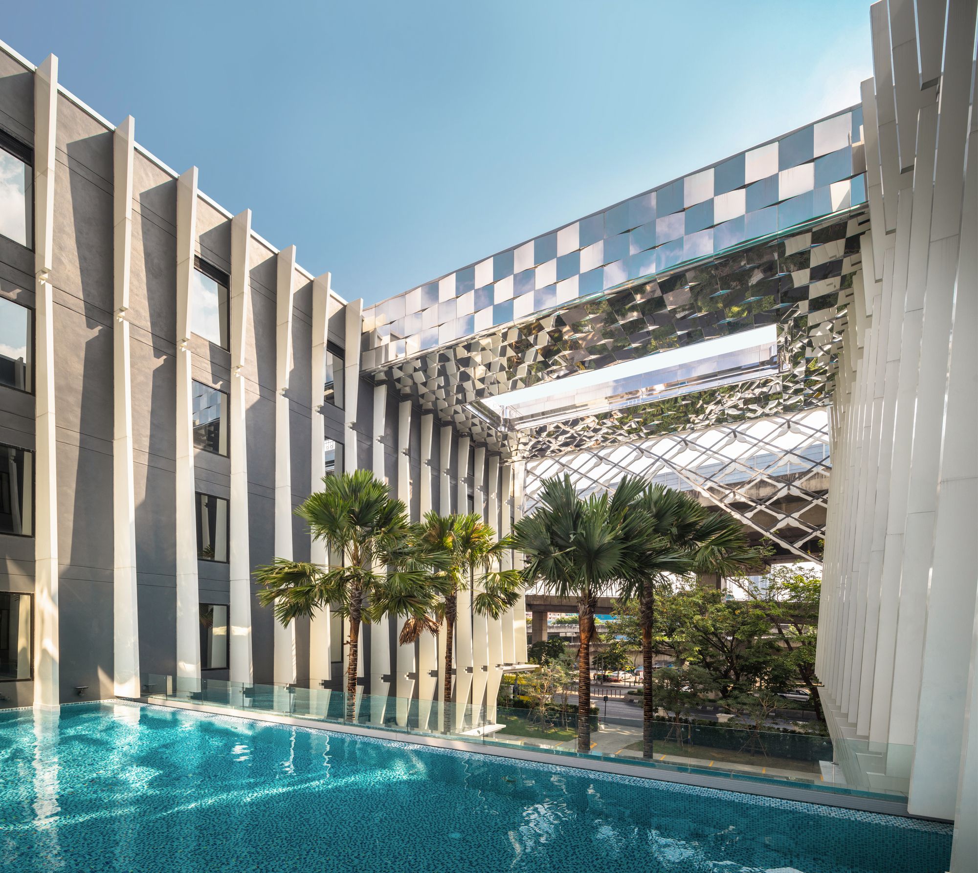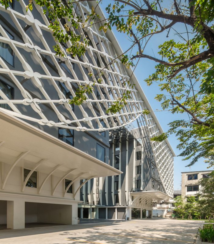 The front side is gradually opened to be a welcome main approach to the building. In the courtyard, the pillar-like vertical fins represent the traditional Thai temple pillar. At the end of the group of pillars, reflecting glass wall is designed and situated in order to create a visual continuous hall. The bridge on the roof is initially designed to be a rooftop bar. Its bottom is covered with mirror finished aluminum composite panels with a different angle in each panel. Not only it creates an illusion reflecting effect but also referred to be identical to a character of mosaic glasses on Thai pagoda.