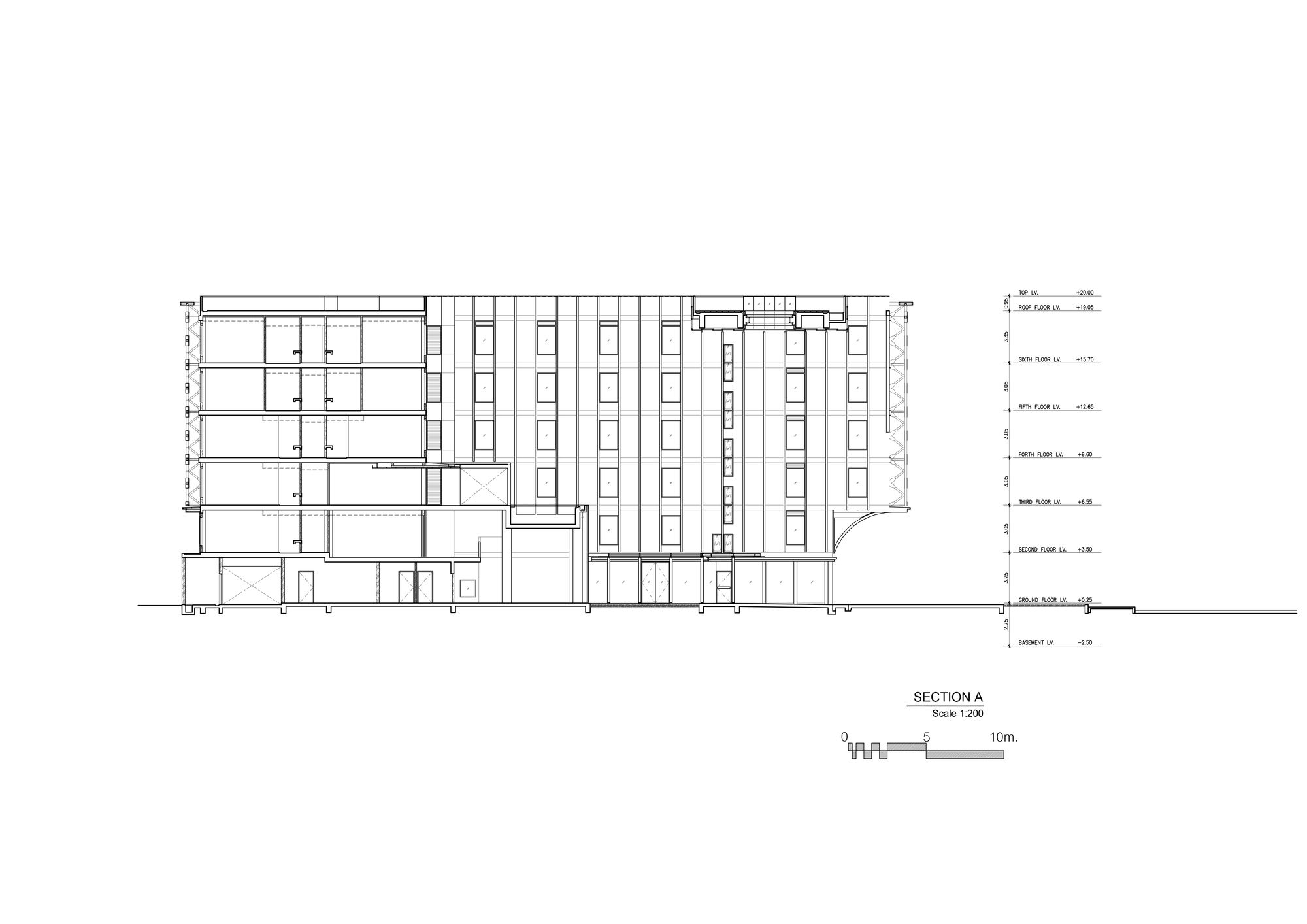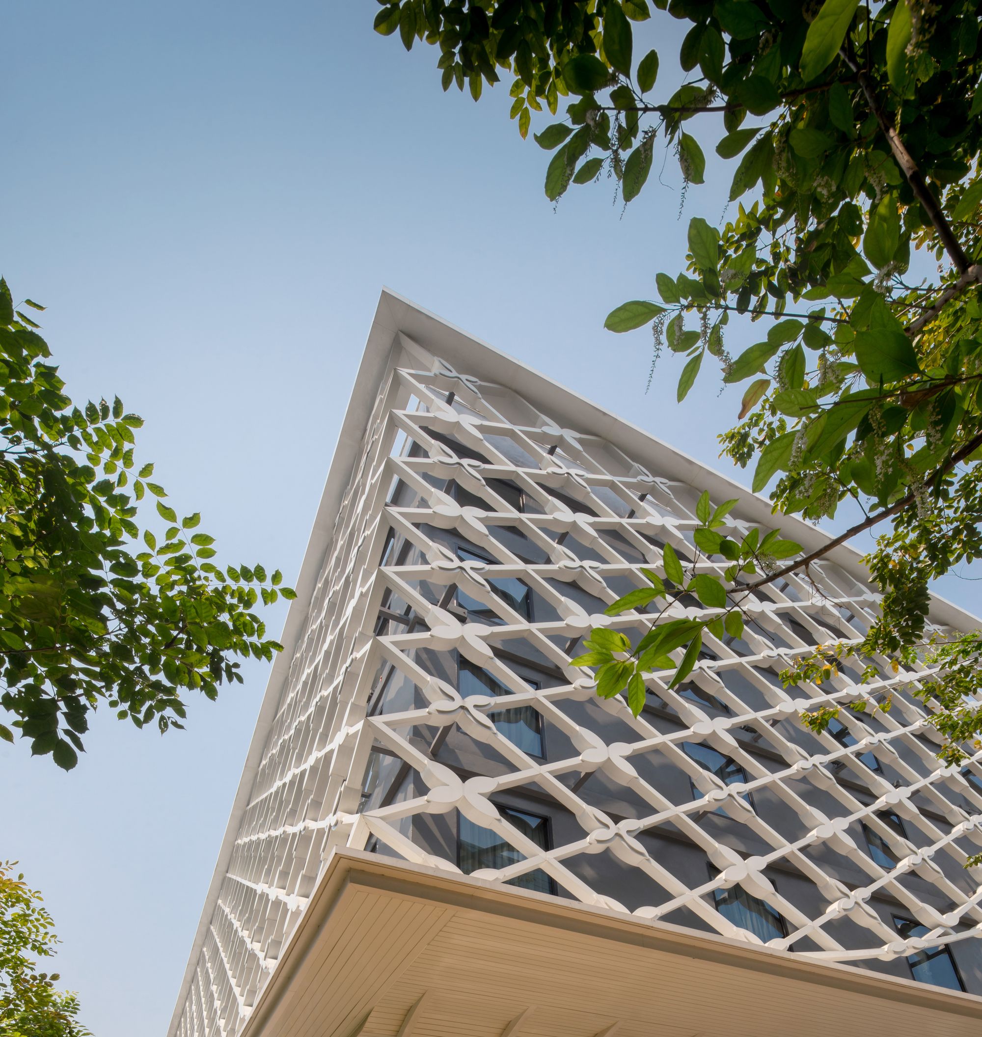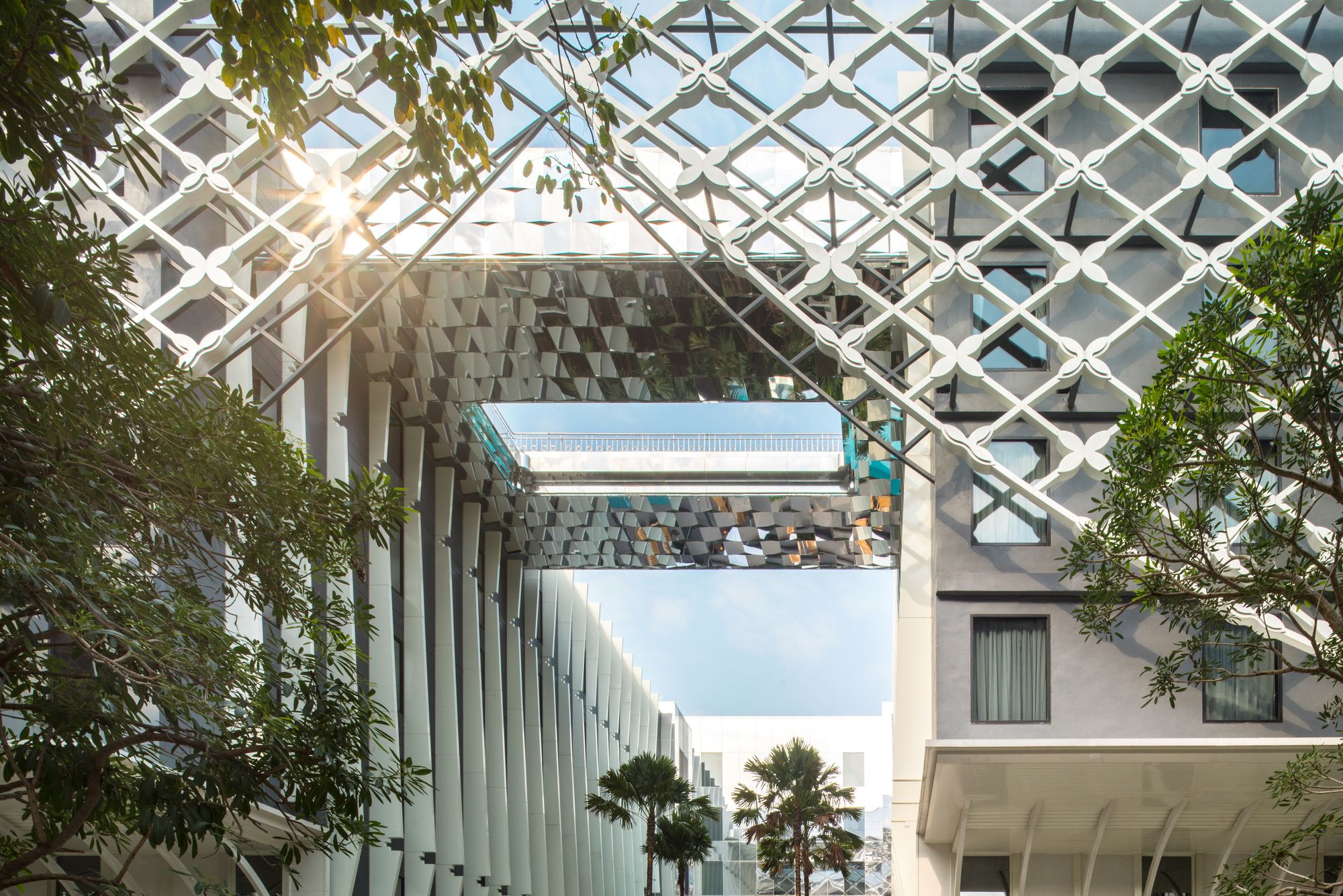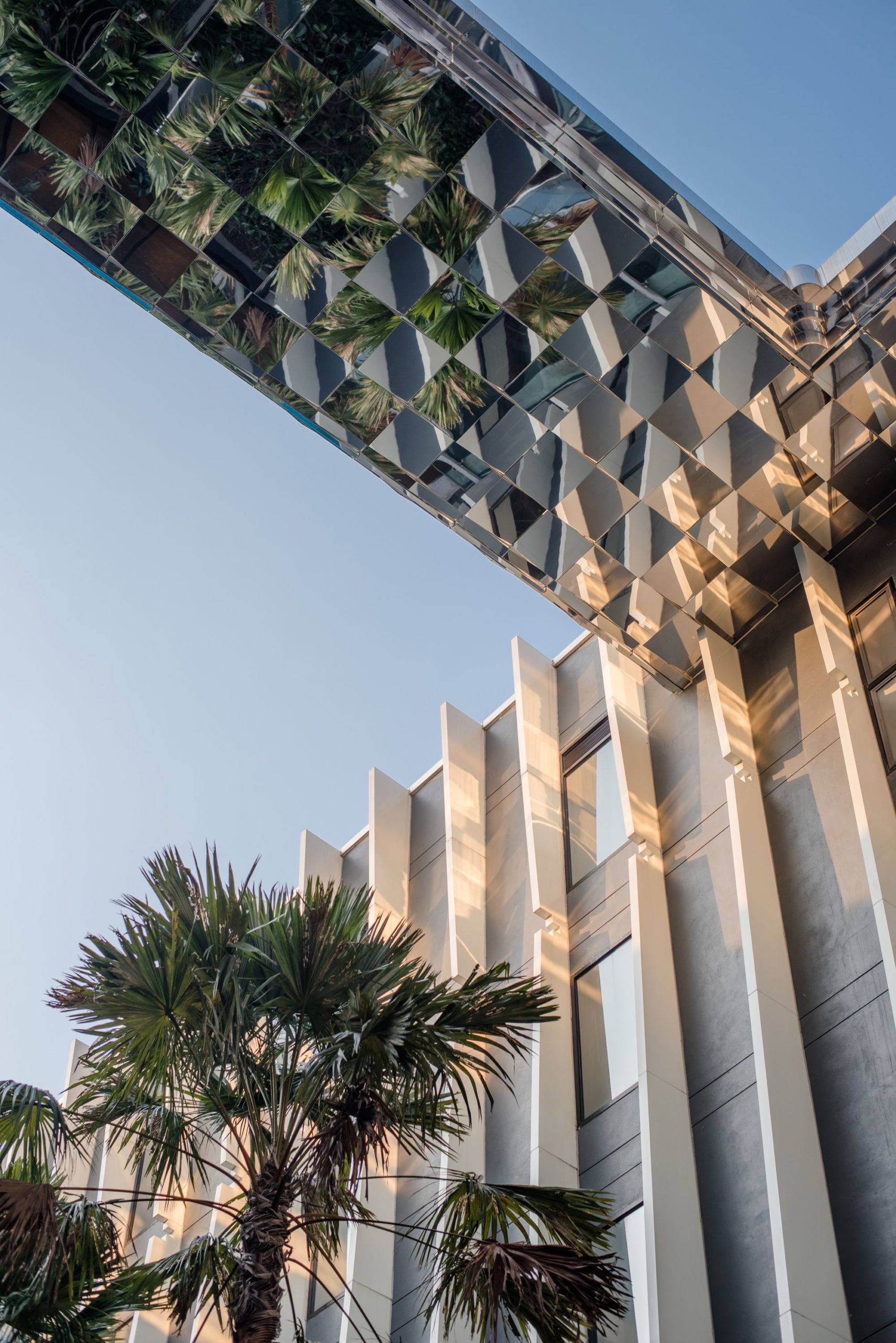 The front side is gradually opened to be a welcome main approach to the building. In the courtyard, the pillar-like vertical fins represent the traditional Thai temple pillar. At the end of the group of pillars, reflecting glass wall is designed and situated in order to create a visual continuous hall. The bridge on the roof is initially designed to be a rooftop bar. Its bottom is covered with mirror finished aluminum composite panels with a different angle in each panel. Not only it creates an illusion reflecting effect but also referred to be identical to a character of mosaic glasses on Thai pagoda.