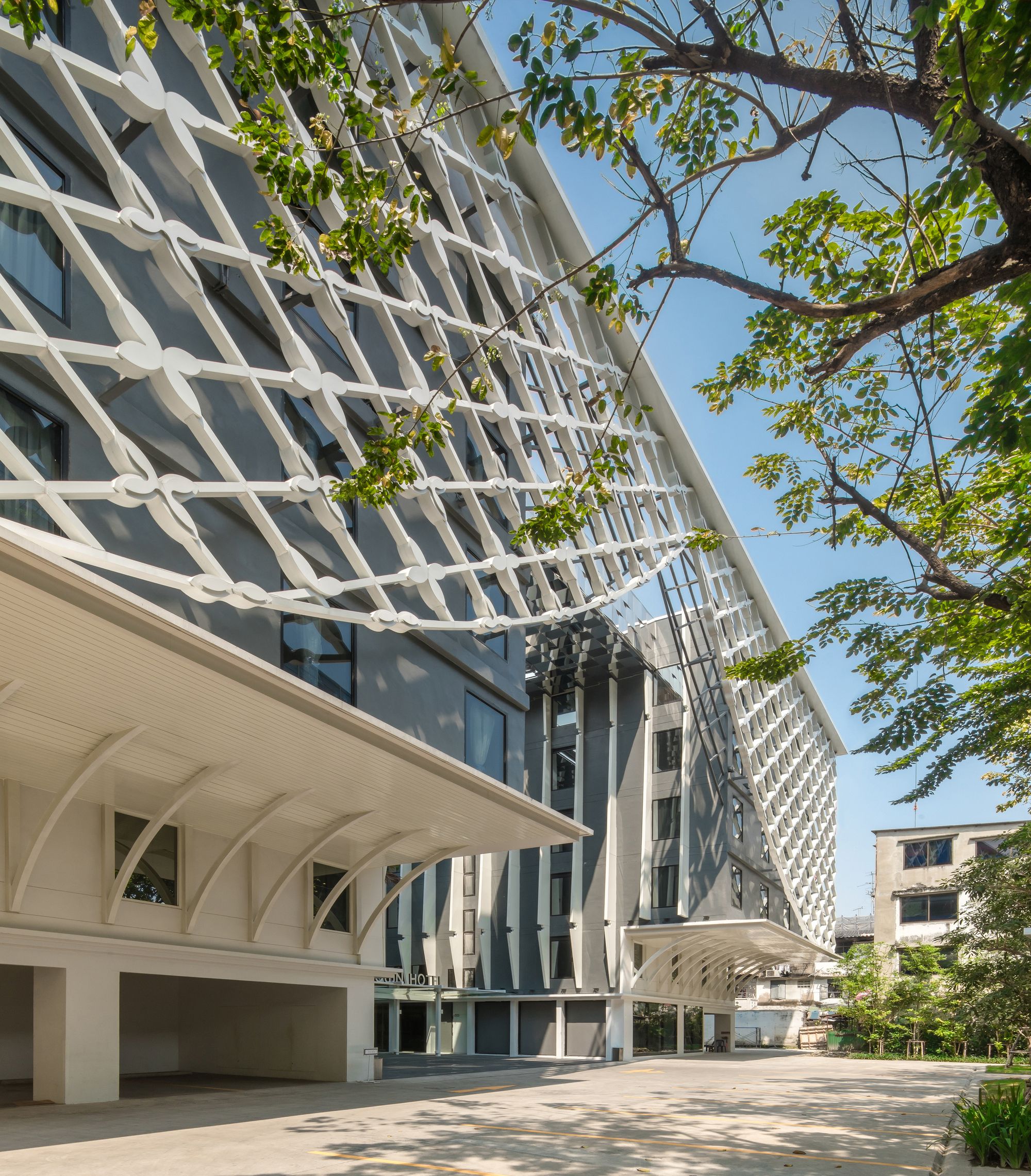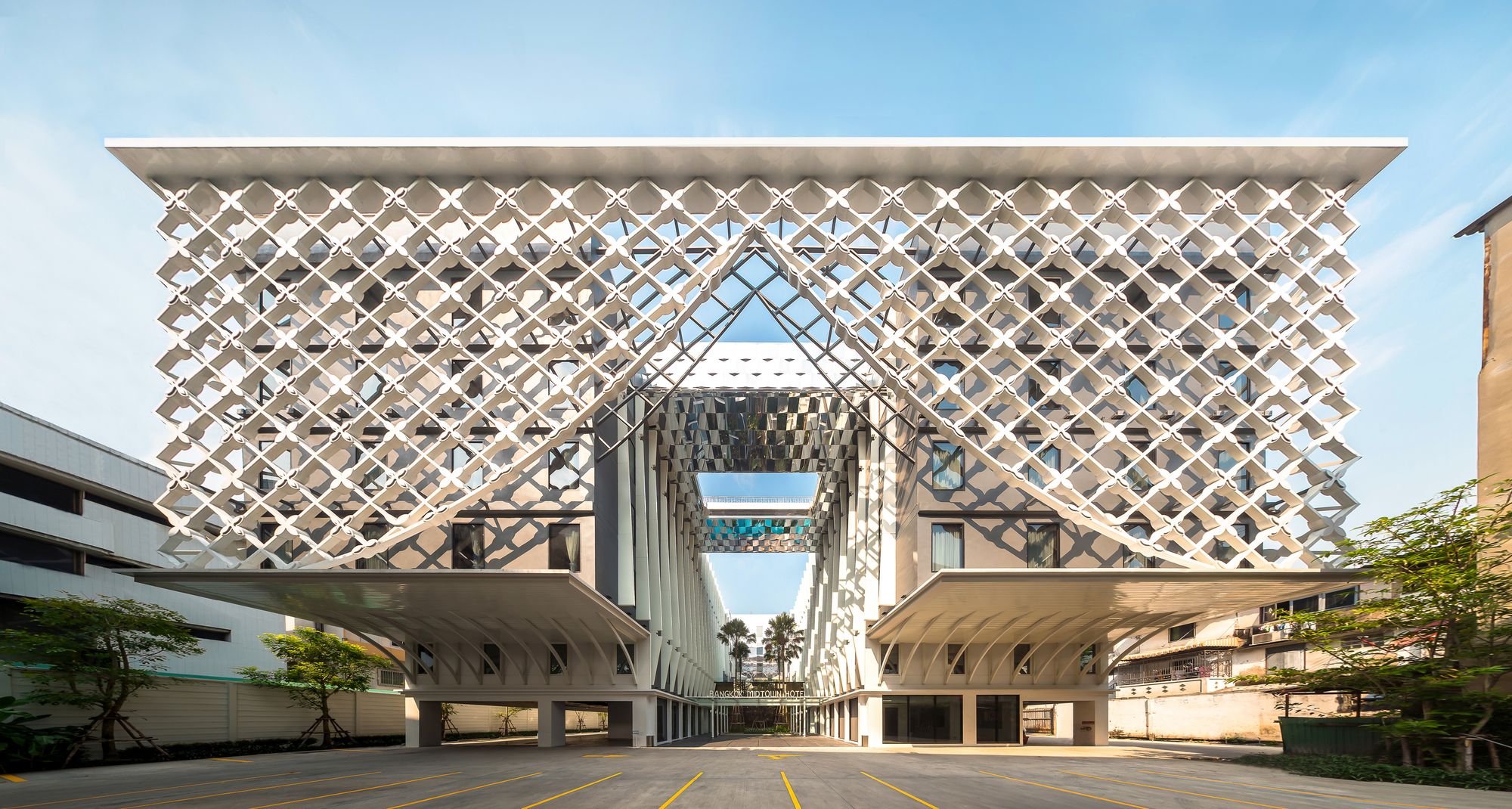 Designed by Plan Architect, Bangkok Midtown Hotel is a 6-story hotel with a multiple of public facilities such as the main lobby, restaurant, swimming pool and Thai spa. The 4-star hotel is located among untidy surroundings and very close to row houses at 3 sides of the site. The only side, the front, that connected to Rama VI road is intentionally designed to engage with an open courtyard.
