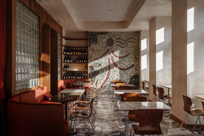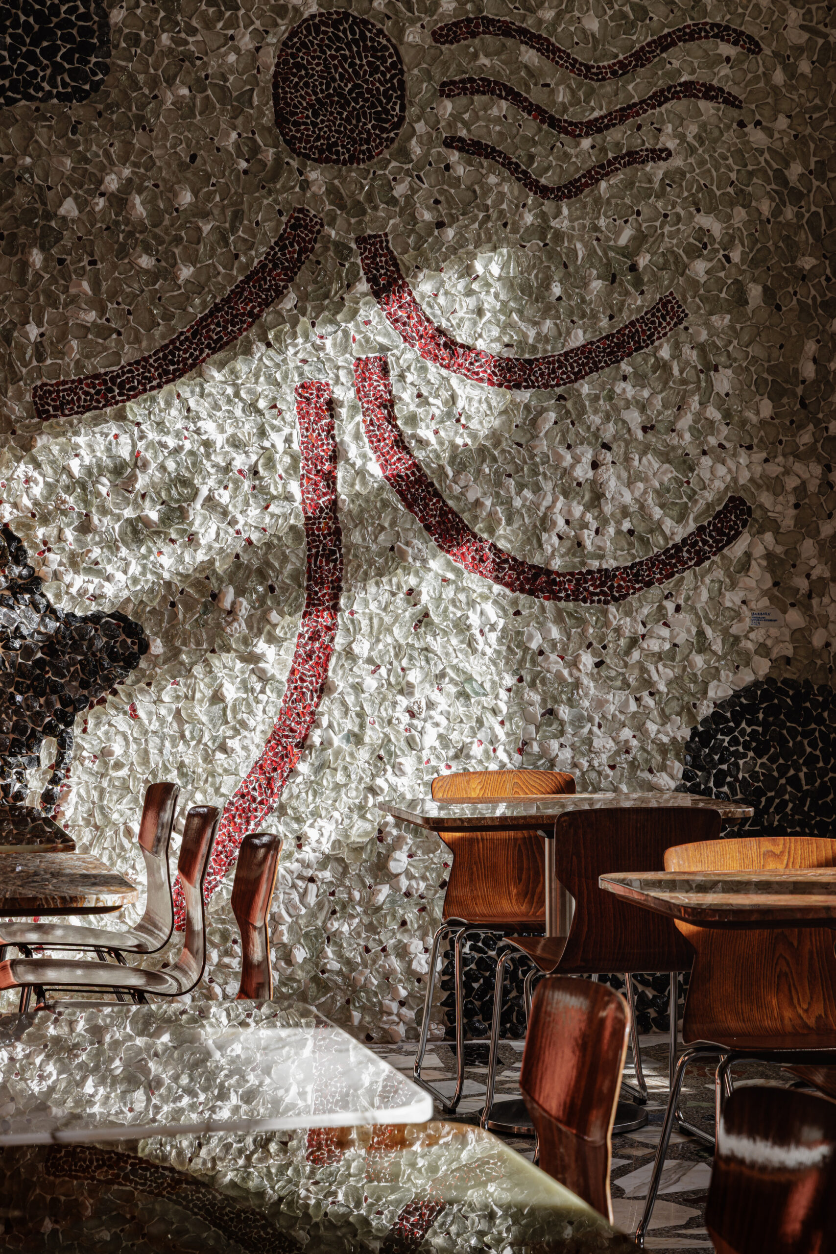Inside the restaurant, you finally get to meet Barbara. She greets you from the central wall that we reserved for a true gem: a mosaic made with plenty of tiny pieces of glass that form the shape of a woman. Barbara tosses her head, setting her hair in motion, looking cheerful and fresh, but also a bit nostalgic. She is a true soul of the place and a piece of art created by Magdalena Łapińska-Rozenbaum. The mosaic is a tribute to the communist-era Poland, abundant in glass wall decorations, while at the same time it pairs beautifully with the new-but-vintage floor.