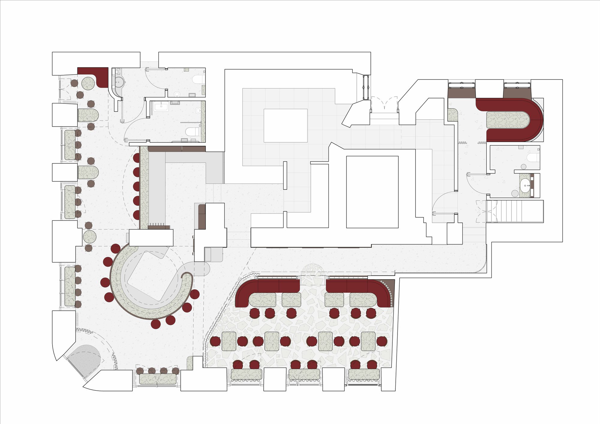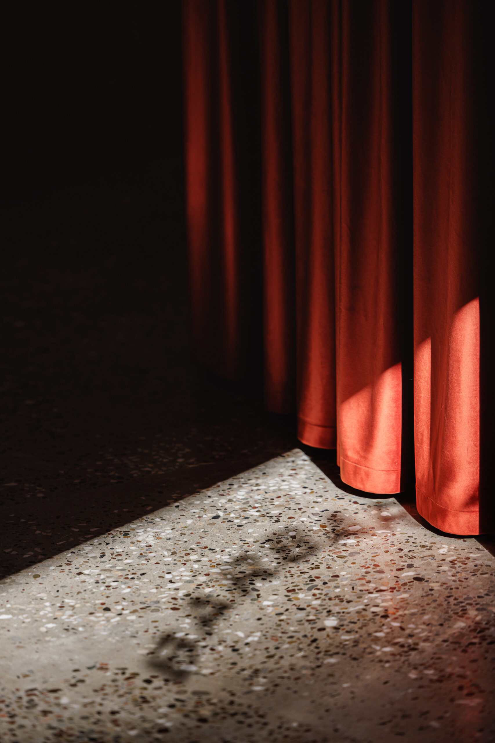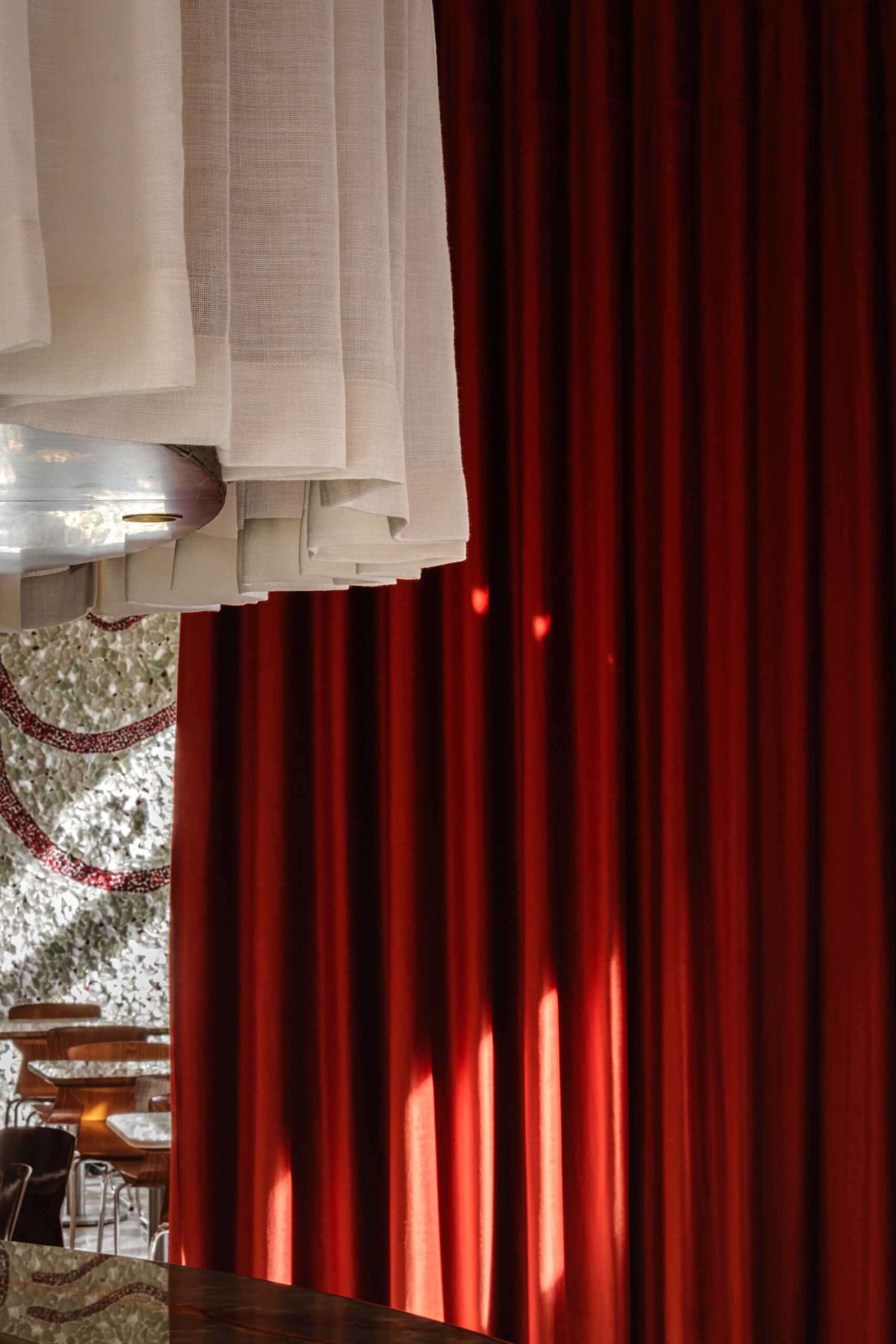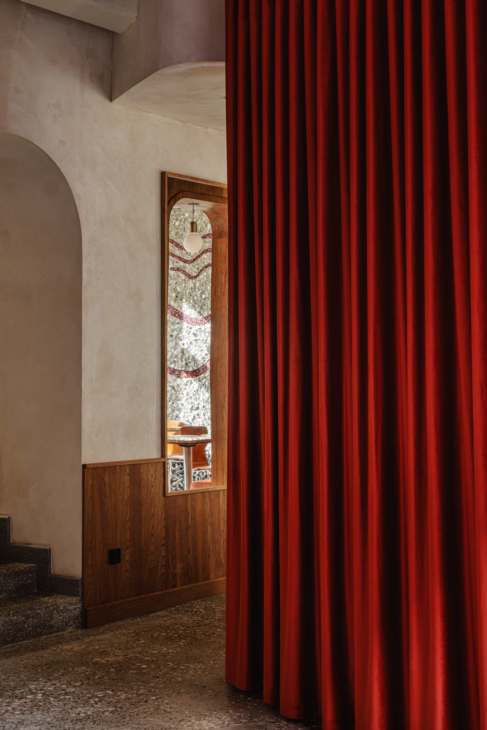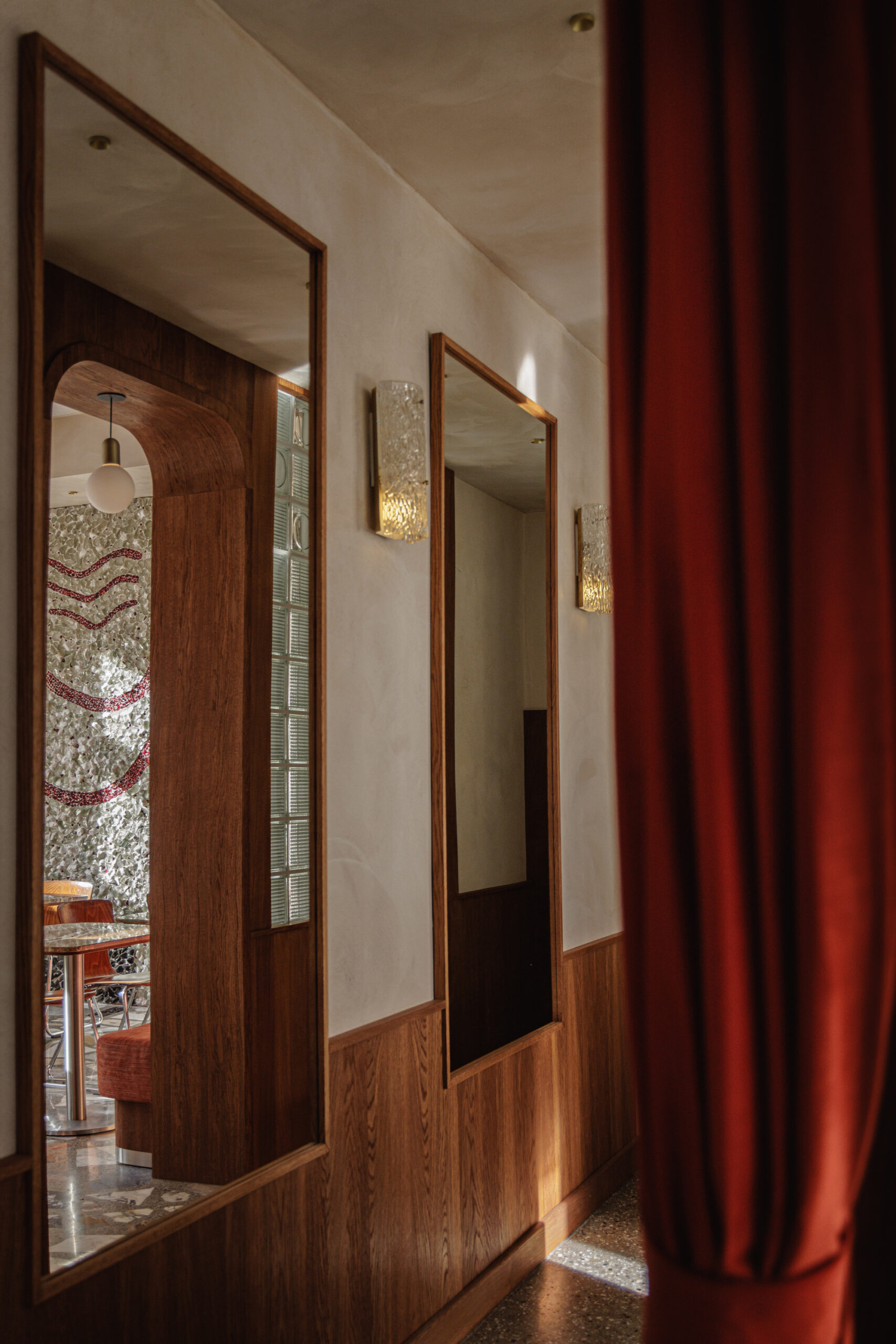 Behind the Curtain – But what’s hidden behind yet another brick-red curtain to the other side of the venue, you may wonder. And then you discover a hidden restaurant accessed through a mysterious wooden portal surrounded by a glass block wall. Inside, marble tables and vintage hazelnut chairs stand on the one-of-a-kind floor made from recycled pieces of marble arranged in a pattern you won’t find anywhere else. We wanted the design of it to harmonize with the original elements of the townhouse, and, together with the investors, we handpicked the marble ourselves.
