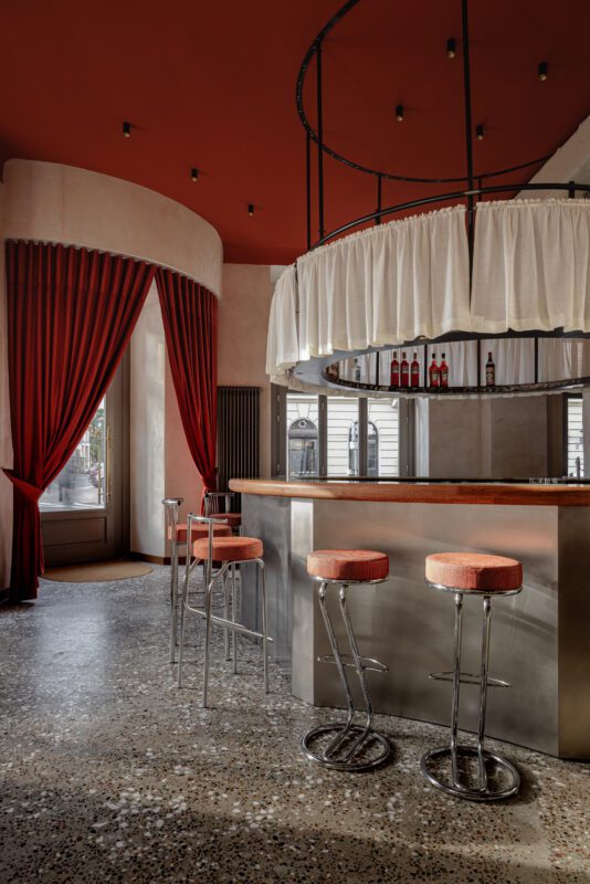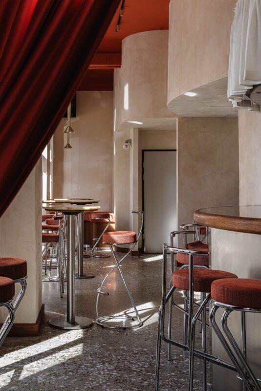 When the sun sets, the venue glows with jewel-like lighting, including vintage sconces we hunted down online, knowing they deserved a second life. The windows are partially hidden with semi-transparent milky curtains. Their delicate fabric warms up the raw, industrial-like plaster, wrapping the interiors in a romantic aura and evoking the charm of Italian trattorias. No matter the time, Barbara unmistakably feels like Warsaw. But there is something about it that makes you think of these Neapolitan bars full of sun and dulce far niente.