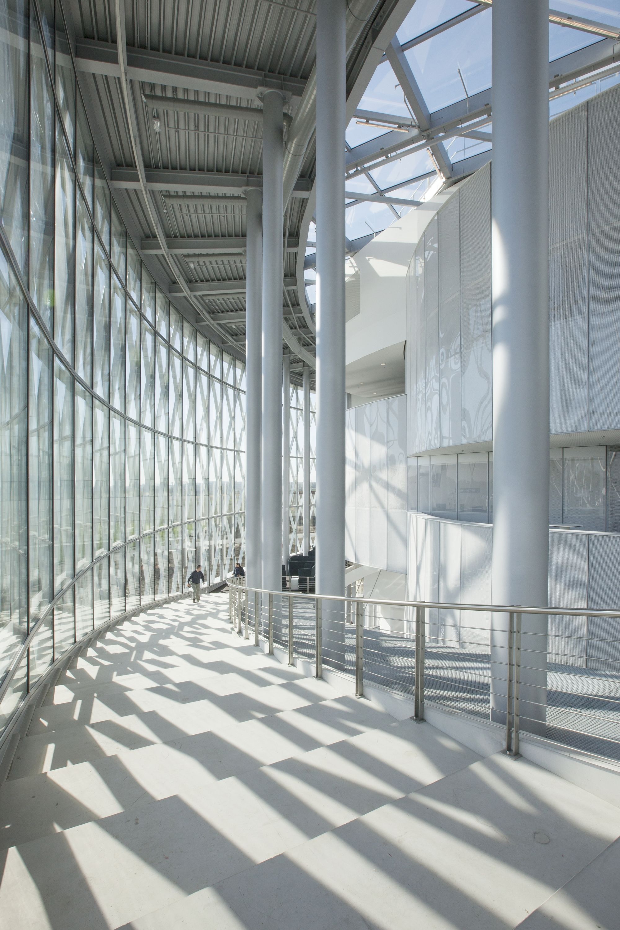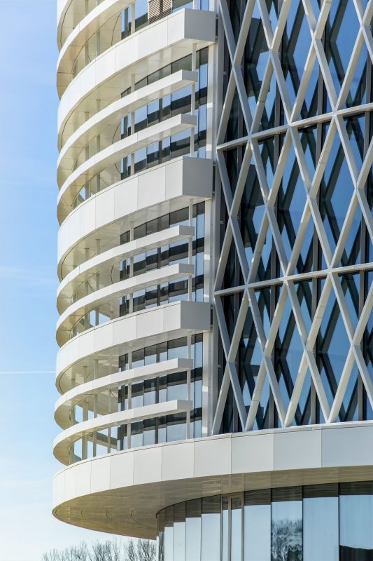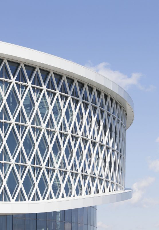 ‘The Circle’ gets the maximum amount of daylight and transparency thanks to the completely glass façade. The clear glass contrasts beautifully with the inset ramp, that adds relief and depth to the building. Three horizontal rows of coffering run along the other sides to provide protection from the sun. In addition to this, the extensive cooling system provides pleasant temperatures within the glass circle.