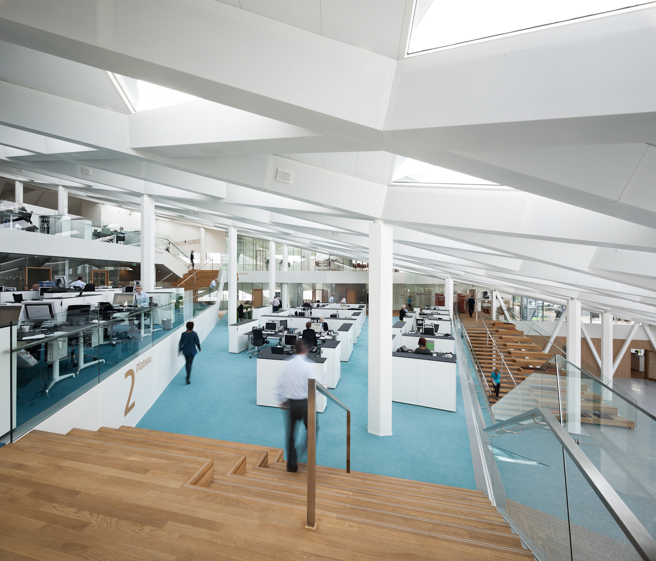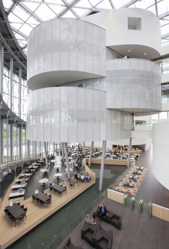 “The interior design also contributes to the social function,” explains John Eyers, CEO at Jaspers-Eyers. “The unique rounded shapes and the internal connections ensure that employees bump into each other more often and create an active ambiance. The oval-shaped ‘meeting decks’ stand out, appearing to float in the space. Passerelles to the fixed cores of the building balance the structure and ensure a constant level of activity.”