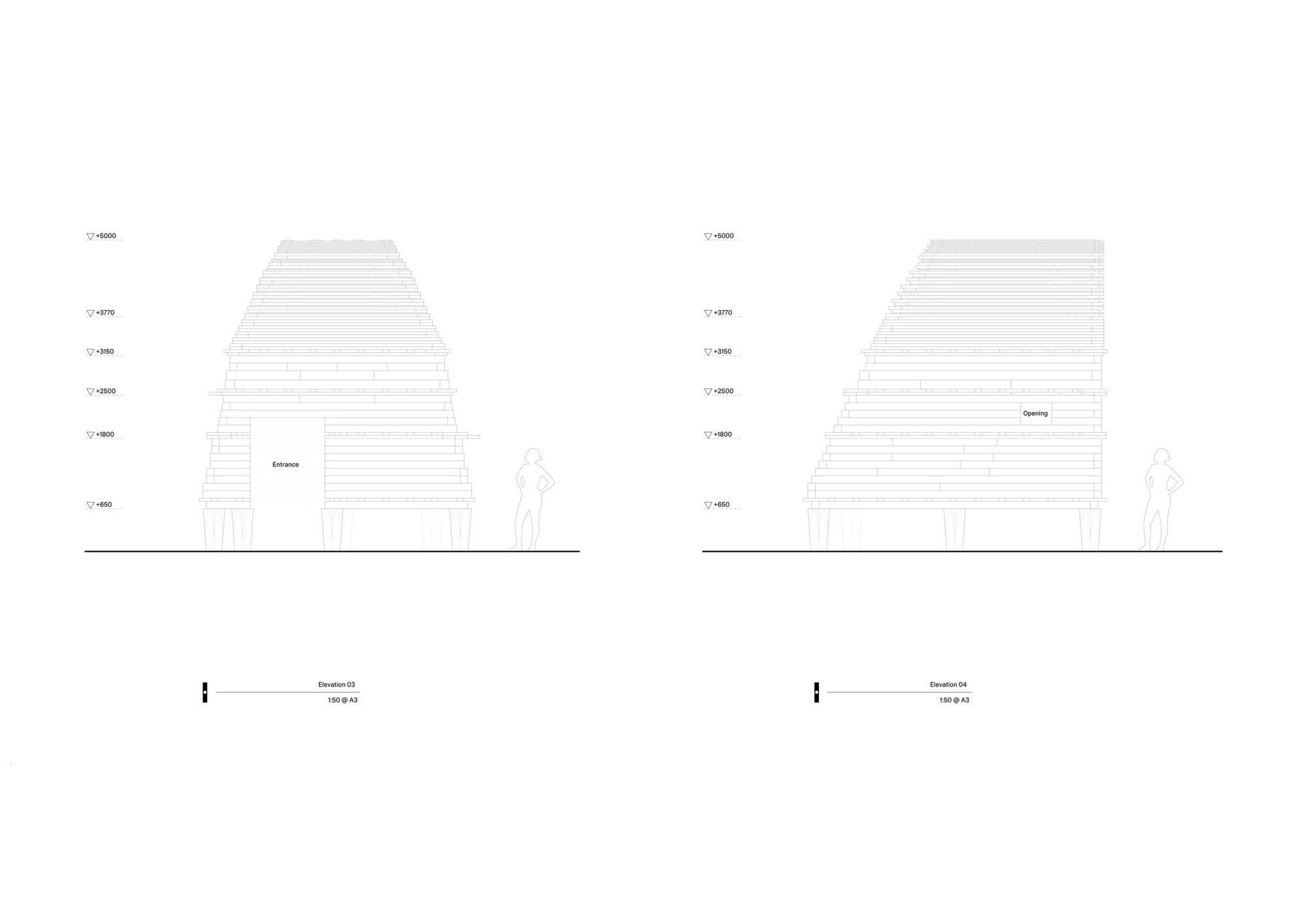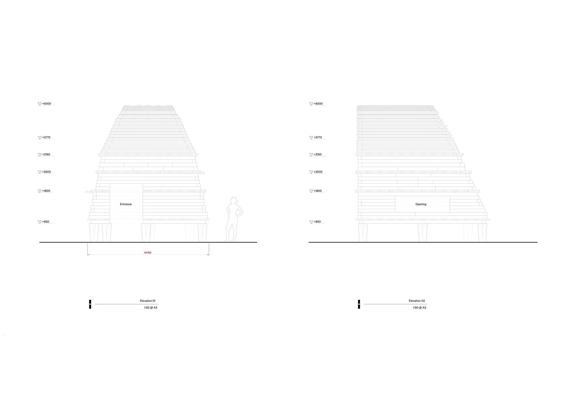 THISS Studio and Tom Svilan’s concept is a timber pavilion of stacked beams tapering up to a pointed form, constructed entirely from salvaged timber sourced from disused Norwegian barns. The structure exposes, reconfigures, and layers the history of its salvaged beams. Weathered surfaces, aged joinery, and old connection details remain visible, telling the story of the wood’s first life. New incisions and precisely machined joints are overlaid, ushering in the timber’s next phase of life.