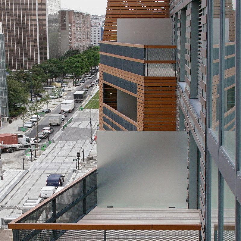The building is energy efficient to accommodate the desires of Paris’ sustainable development efforts. The Plan Climates goal is that future housing will consume 50KW-h.m.² or less. The objectives of energy performance and the construction timetable were met by focusing on a simple, well insulated and ventilated object that functions at its best year round. Accommodations are cross ventilating and allow abundant day lighting throughout the apartment. External corridors and glass staircases also promote natural lighting in the common circulation, affording energy while also creating comfortable and well lit social spaces. The building is insulated from the outside with an insulation thickness of 20 cm. Thermal bridge breakers are used on corridor floors and balconies to avoid thermal bridges. Ventilation is controlled by double flow mechanical ventilation, providing clean air in every apartment with an optimum temperature throughout the year. The incoming air also reuses heat from the exhaust air. The roof is covered with 300m² of photovoltaic panels to generate electricity. Rainwater is harvested on site in a basin pool used for watering outdoor green spaces.