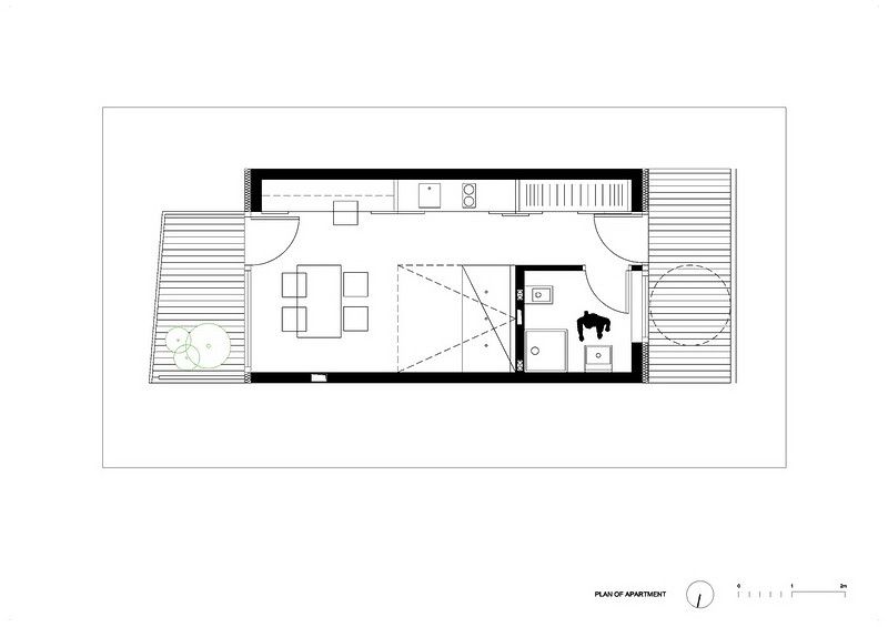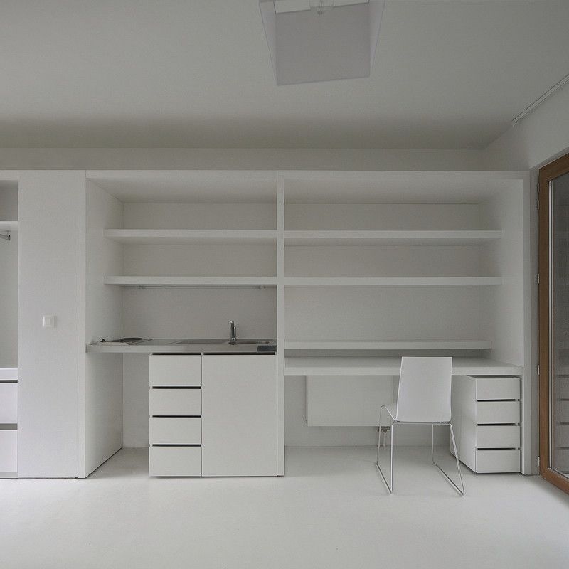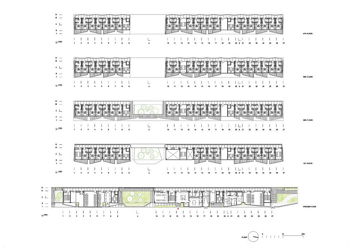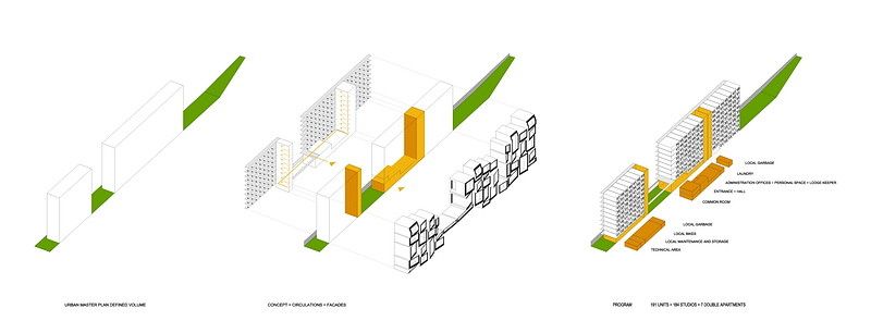 The long volume of the building is divided into two parts connected by a narrow bridge. Between two volumes there is a garden. The building has 11 floors: a technical space in the basement, shared programs on the ground floor, and student apartments in the upper nine floors. The layout is very rational and modular.