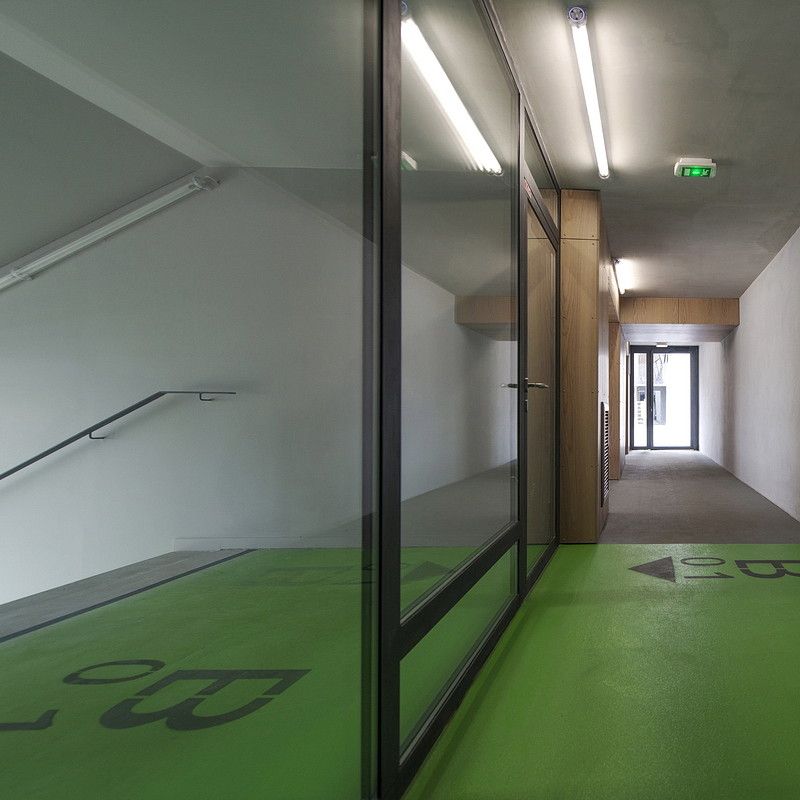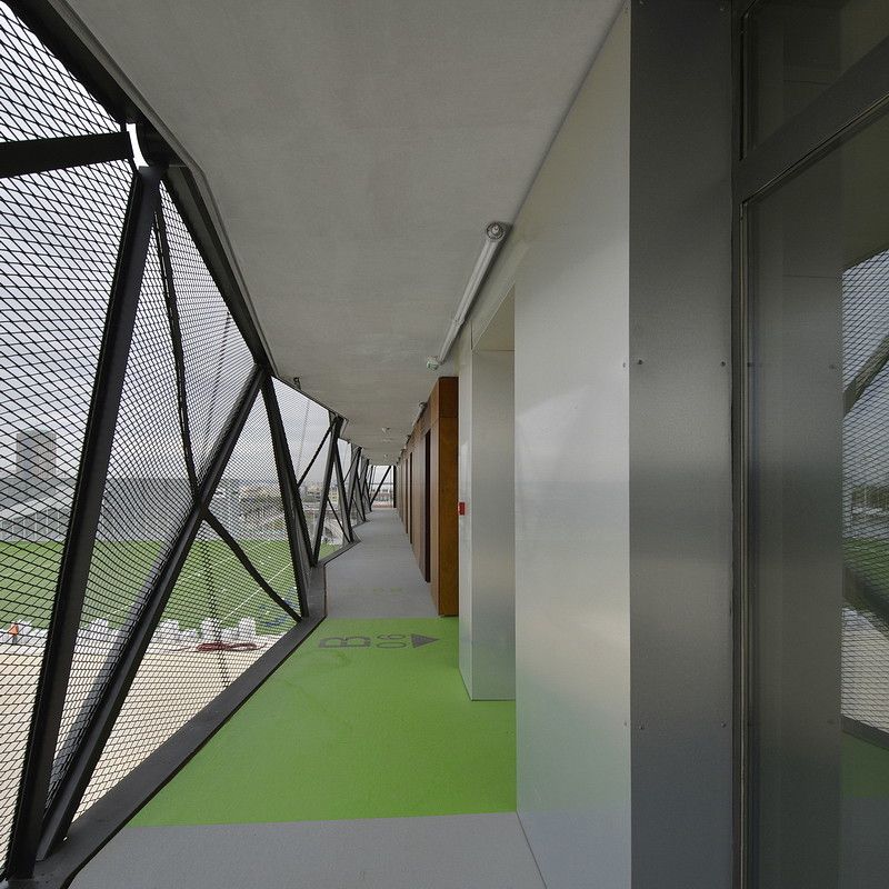 The major objective of the project was to provide students with a healthy environment for studying, learning and meeting. Along the length of the football field is an open corridor and gallery that overlooks the field and creates a view to the city and the Eiffel tower. This gallery is an access to the apartments providing students with a common place. All the studios are the same size and contain the same elements to optimize design and construction: an entrance, bathroom, wardrobe, kitchenette, working space and a bed. Each apartment has a balcony overlooking the street.
