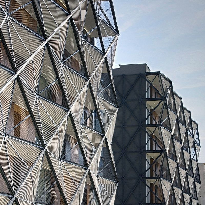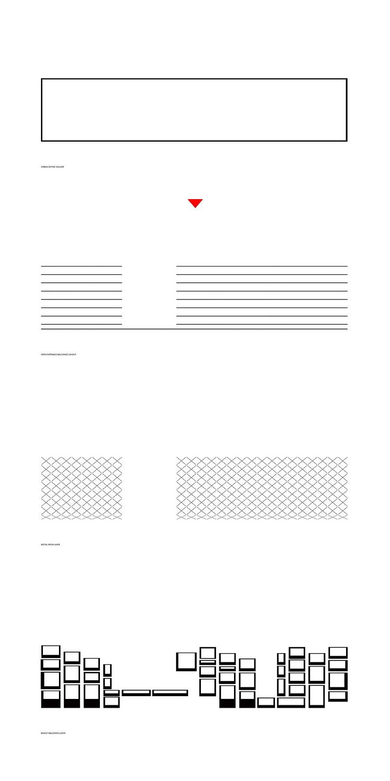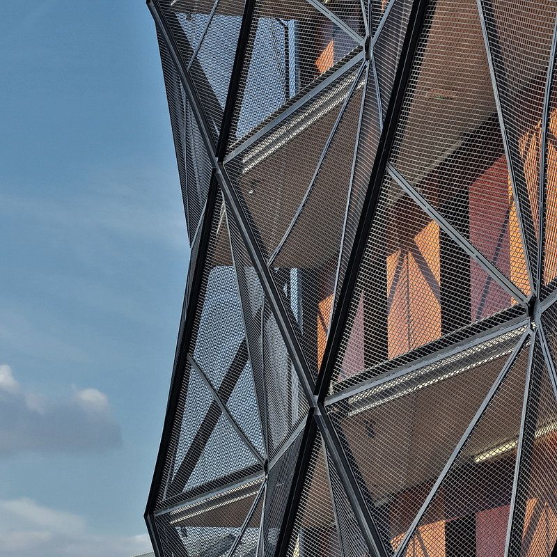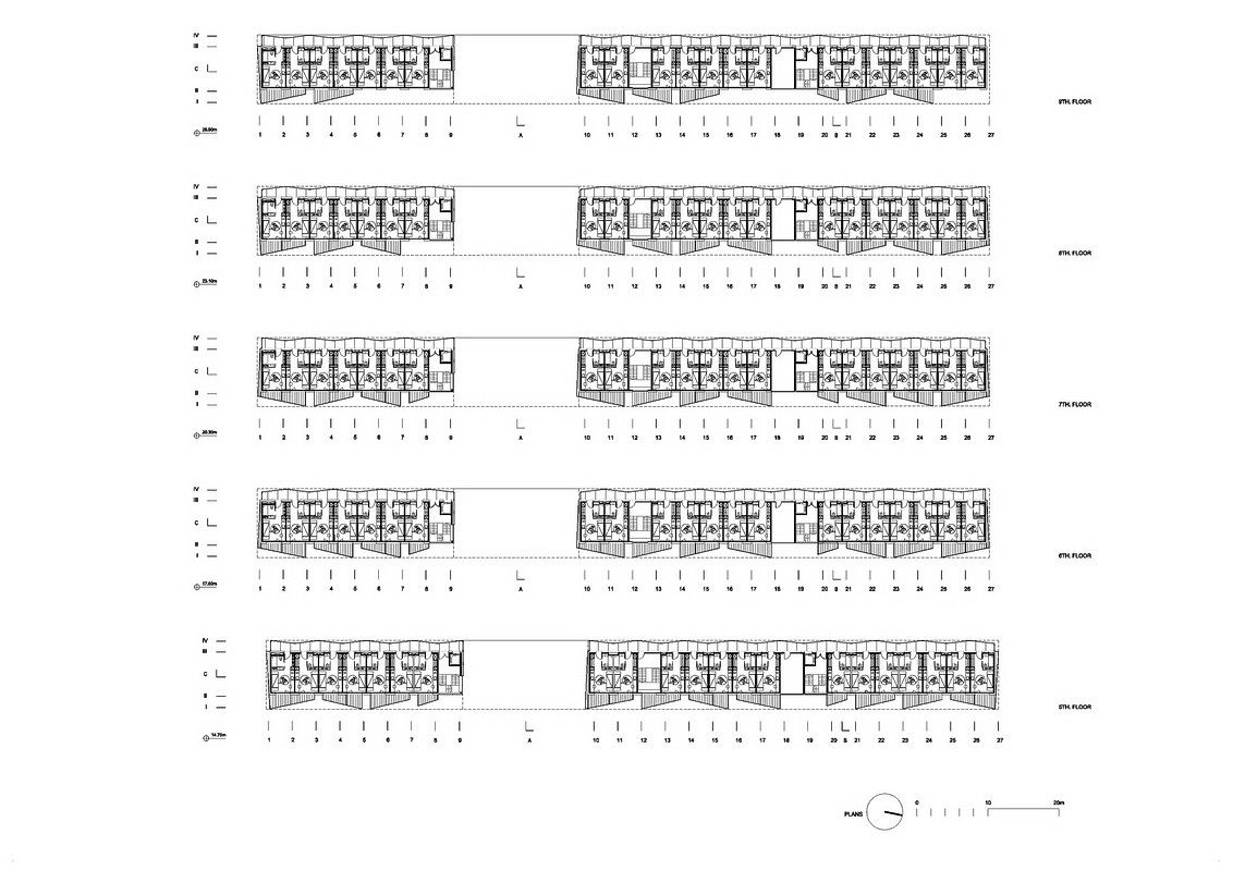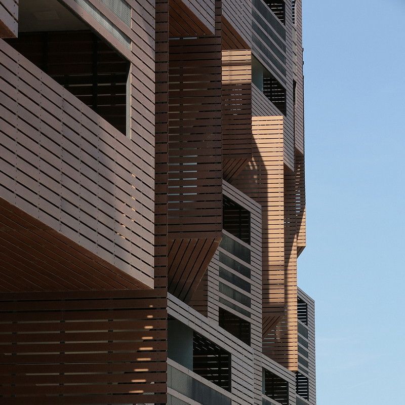 Narrow length of the plot with 10 floors gives to site a significant presence. Each volume contains two different faces according to the function and program: