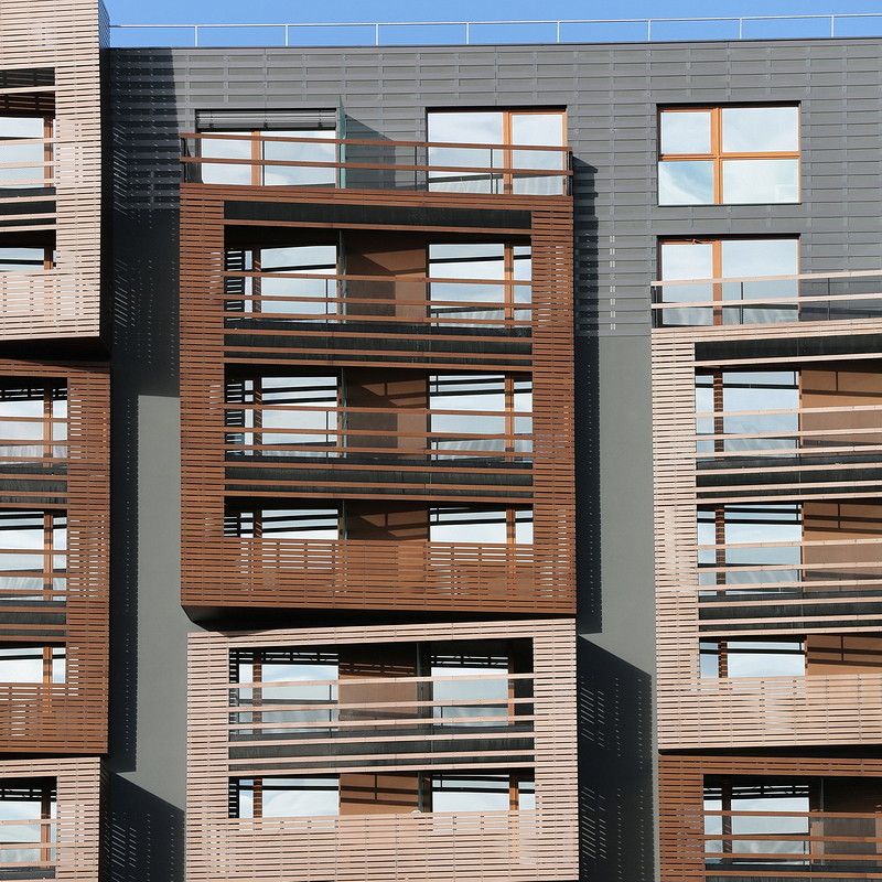 The elevation towards the street des Petits Ponts contains studio balconies-baskets of different sizes made from HPL timber stripes. They are randomly oriented to diversify the views and rhythm of the façade. Shifted baskets create a dynamic surface while also breaking down the scale and proportion of the building.