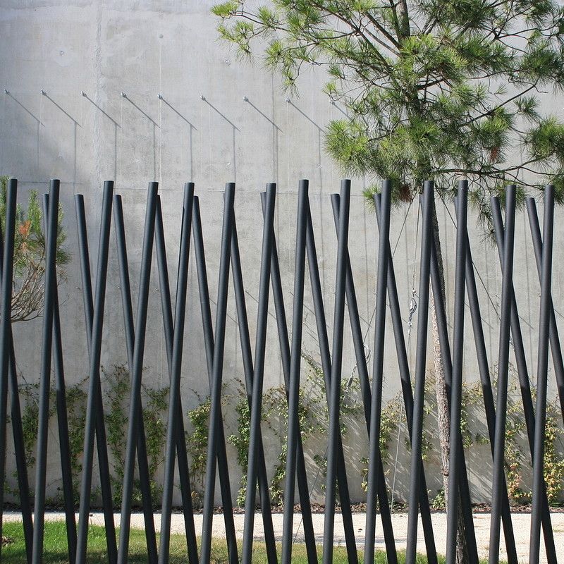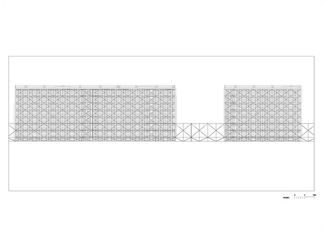 The elevation towards the football field has an open passage walkway with studio entrances enclosed with a 3D metal mesh. Both volumes are connected on the first floor with a narrow bridge which is also an open common space for students.